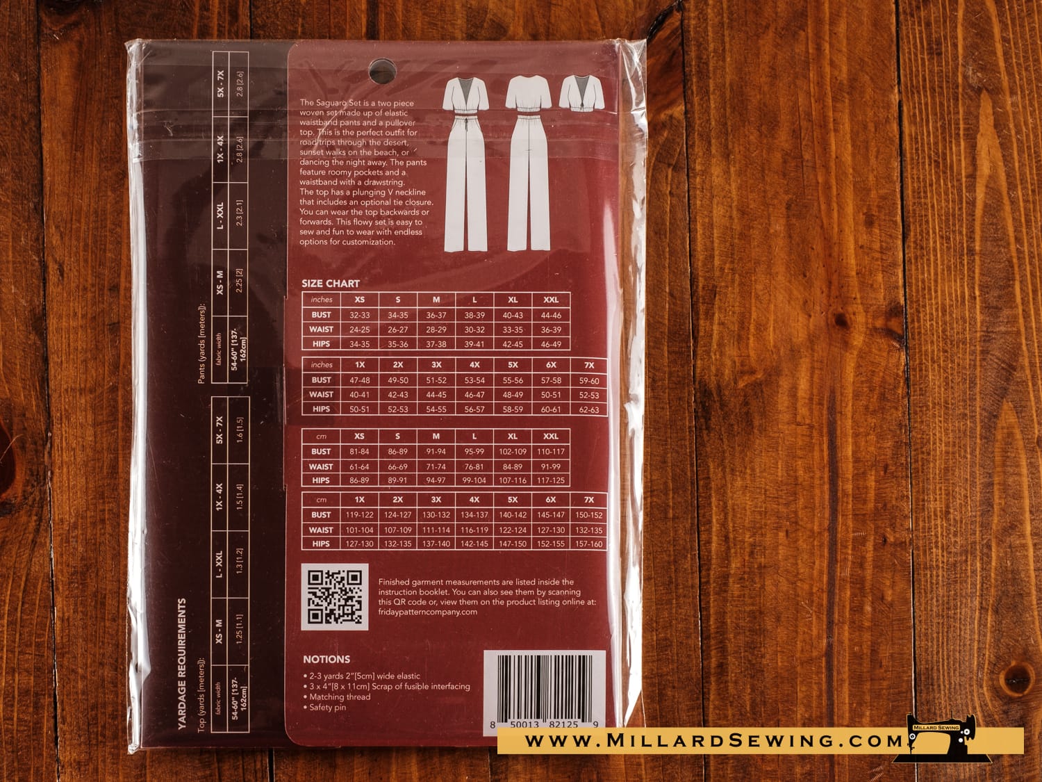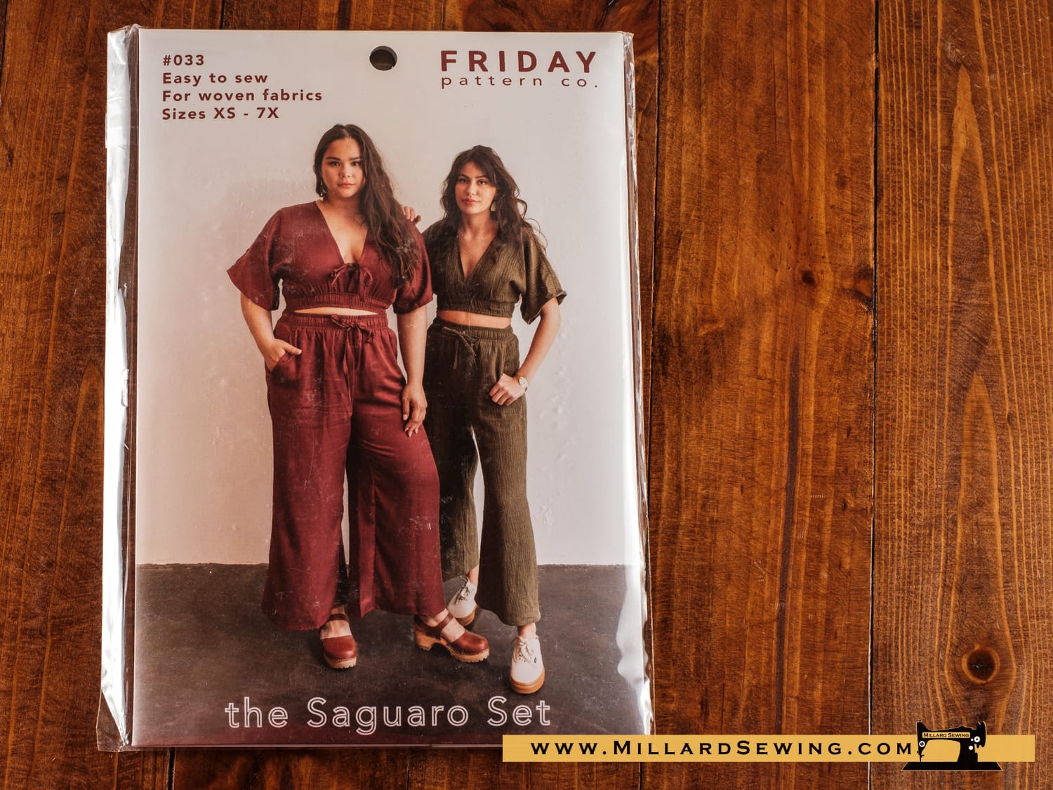 The Saguaro Set is a two piece woven set made up of elastic waistband pants and a pullover top. This is the perfect outfit for road trips through the desert, sunset walks on the beach, or dancing the night away. The pants feature roomy pockets and a waistband with a drawstring. The top has a plunging V neckline that includes an optional tie closure. You can wear the top backwards or forwards. This flowy set is easy to sew and fun to wear with endless options for customization.