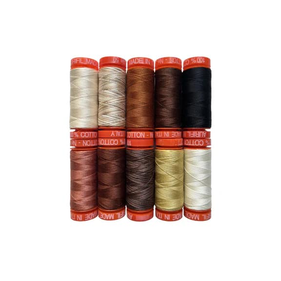 The centerpiece of the 2026โ2027 Hoffman Challenge is Coffee Shoppe, a stunning new batik collection featuring 18 rich and cozy tonesโ from earthy browns and deep blues to taupe, burnt orange, and charcoal. Participants are required to use at least 5 of the 18 featured batiks and are encouraged to highlight their creations with threads from the coordinating Aurifil thread setโ ten small spools of 50wt thread in a warm, inviting palette that perfectly complements the collectionโs comforting hues.