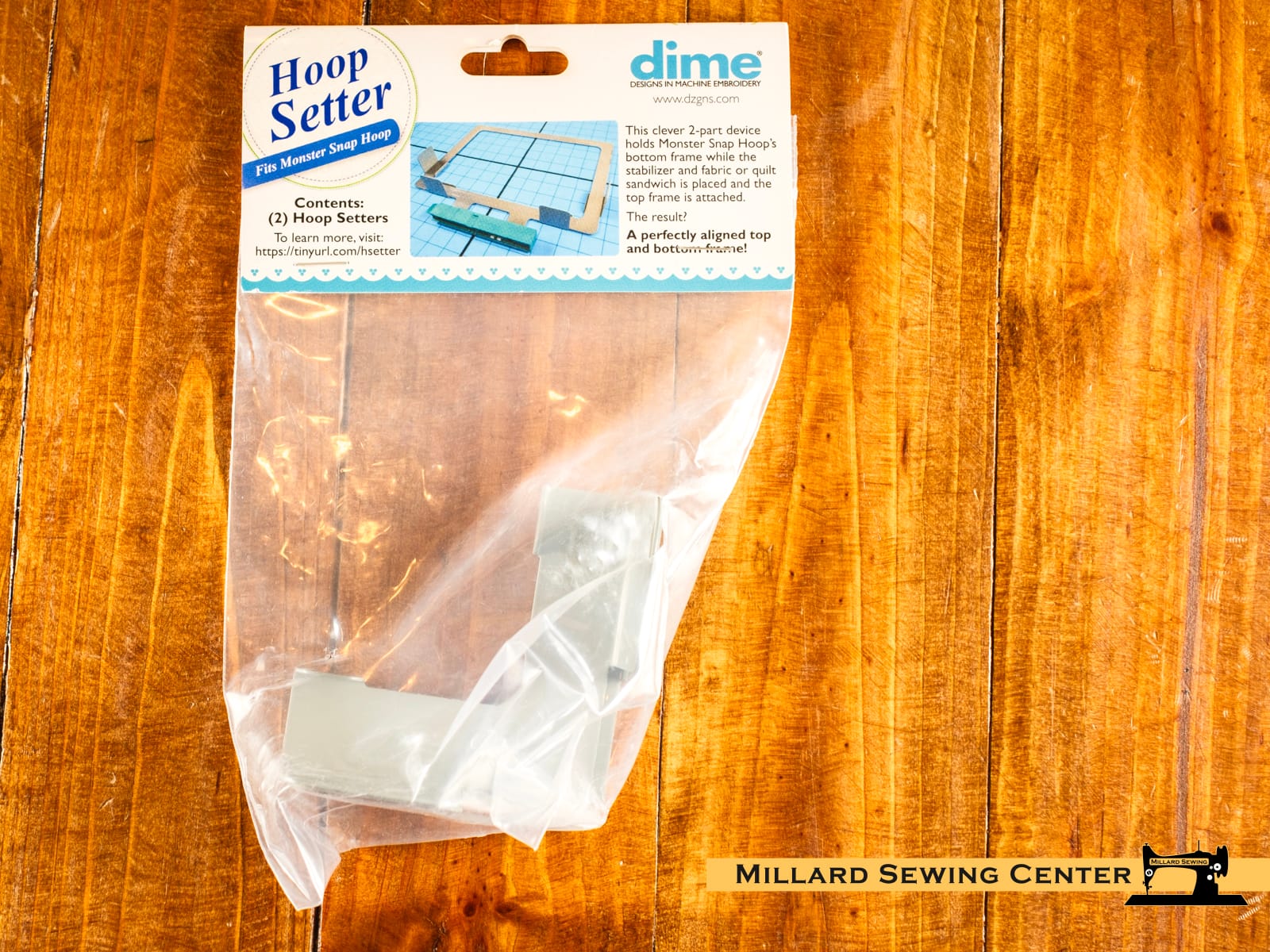 This clever 2-part device holds Monster Snap Hoopโs bottom frame while the stabilizer and fabric or quilt sandwich is placed and the top frame attached. The result? A perfectly aligned top and bottom frame. Place the Hoop Setter on a work surface โ we prefer Dimeโs Hoop Mat โ and slide Snap Hoop Monsterโs metal frame into the Hoop Setters. On large hoops, we place the Setters on the corners closest to the attachment. On small hoops, attach the hoop setters to the corners opposite the attachment.