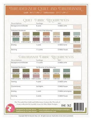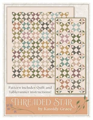 The Threaded Star Quilt Pattern, designed by Kassidy Grace, showcases beautifully intertwined sawtooth stars created using flying geese and square in a square units. Each block is enhanced by corner accents that emphasize the interplay of prints. This quilt features fabrics from the Threads of Grace collection from Riley Blake Designs and can be made in either queen size or as a fat- quarter friendly table runner.Finished sizes: Quilt 84.5in x 96.5in Tablerunner size: 23.5in x 59.5in