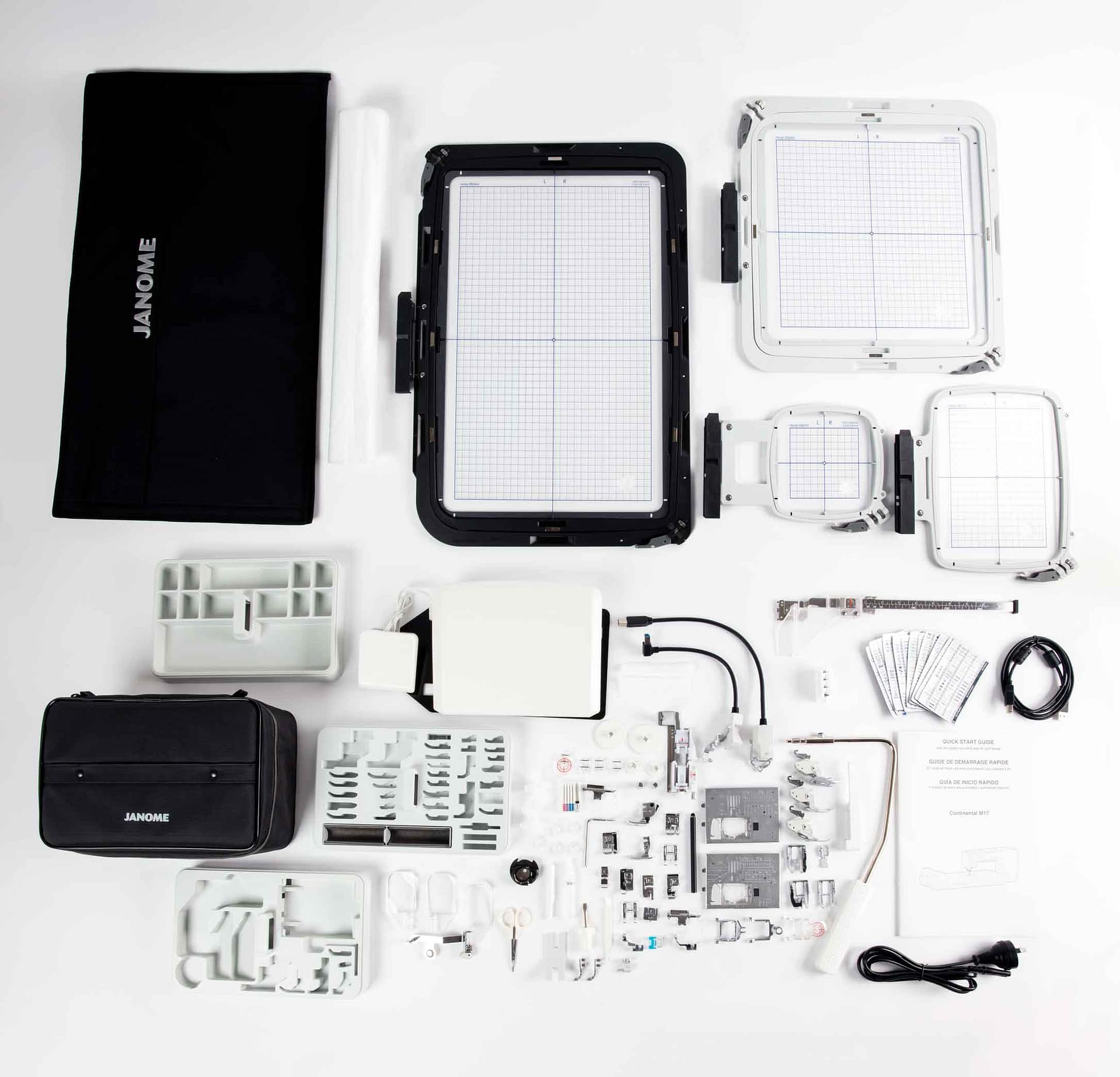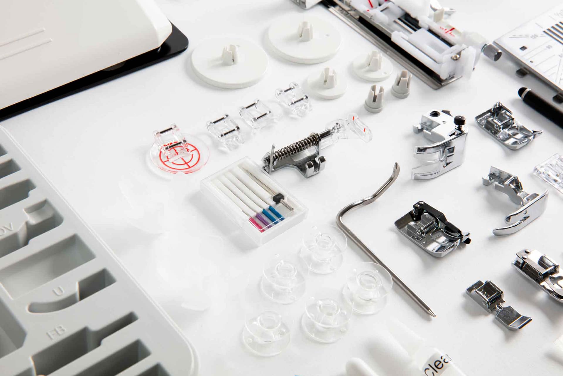 - Built-in Storage Space in the embroidery unit extension tables, top, and back of machine