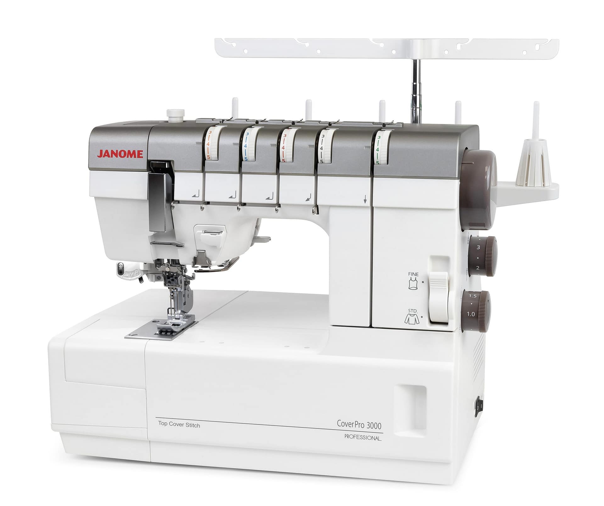 Cover Hem Sewing Machine featuring Top Cover Stitch. Features Tension Level Control (TLC) system for easy adjustments from fine to heavy fabrics. Machine engineered with ball bearing for more durable, smooth and stable sewing. Needle threader included. The CP3000P is the brightest Cover Hem on the market with LED in 3 different places including Janomeโs extending High light. Quick reference chart provides full color reference guide to help you adjust to the perfect stitch without consulting manual. Unique free arm capability, LED light, 1,000 stitches per minute, three needle 3-6mm widths, chain stitch, EZ Looper threading, extra long bed, Instructional DVD, Instruction book in English/Spanish/French. (5 cones of thread and dust cover included.)
