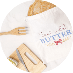 - The Just Add Butter Cinch Sack:ย (As mentioned above!) The ideal, embroidered bread bag for gifting your homemade loaves or storing your own.