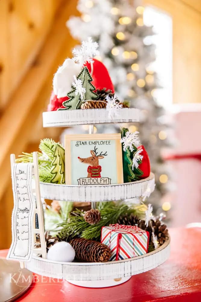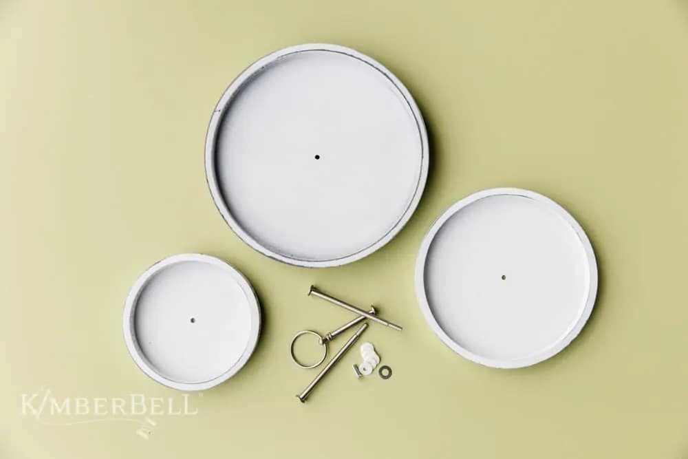 Create darling decor with Kimbebellโs Three-Tier Tray! With three round trays in graduating sizes, our collapsible tray is perfect for all of your seasonal displays. Fill with projects from Kimberbellโs North Pole Tier Tray event or use year-round for sewing notions, food, and holiday fun! With distressed white wood for a rustic farmhouse look, our Three-Tier Tray is a stylish accessory for a variety of uses.