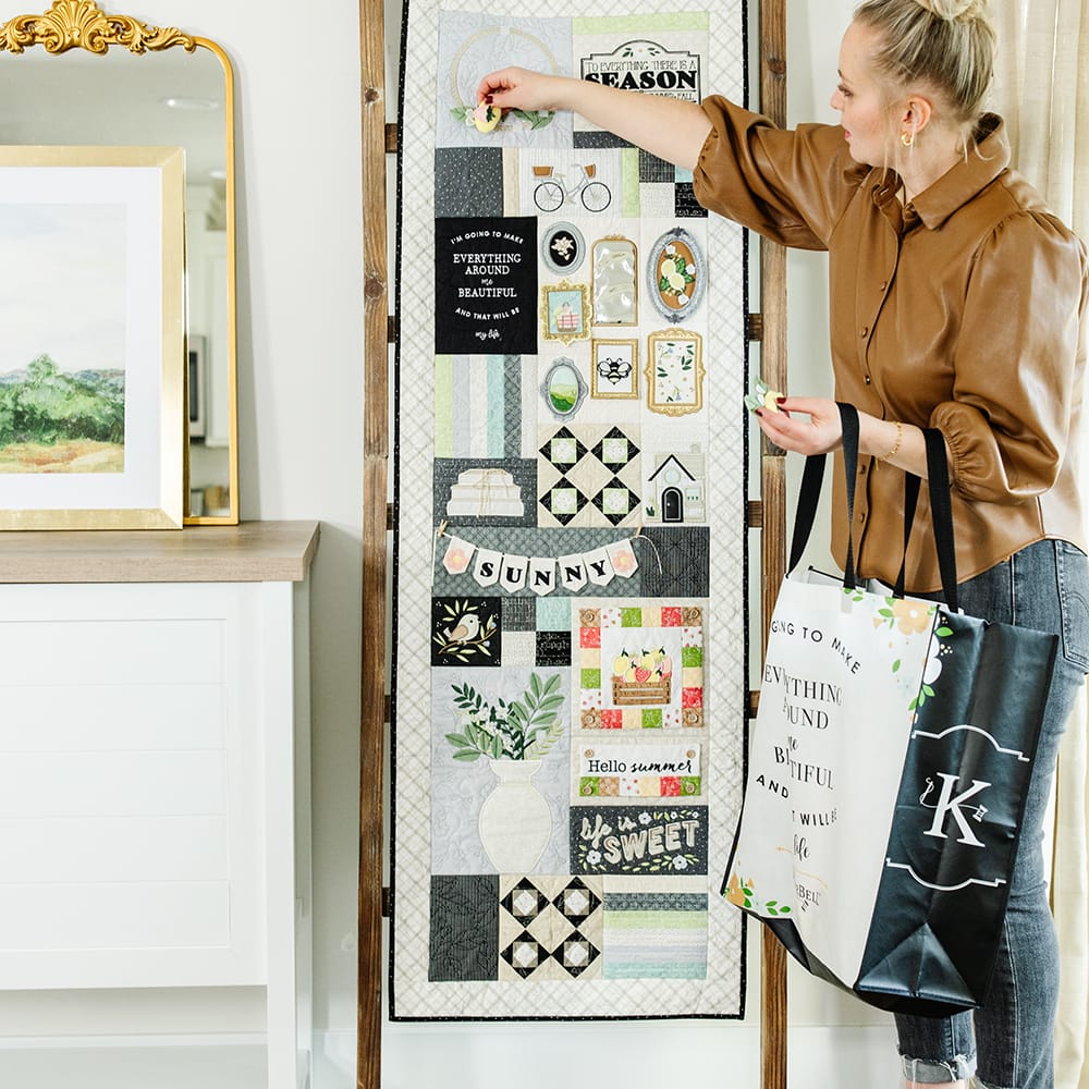 Store seasonal embellishments, quilting supplies, and sew much more in Kimberbell’s Quilting Through the Seasons Tote! Our farmhouse-style tote is a roomy 18 x 18”, with sturdy handles and a sweet sentiment. Made to perfectly coordinate with our Quilting Through the Seasons Ladder Quilt, this stylish tote is always in season!