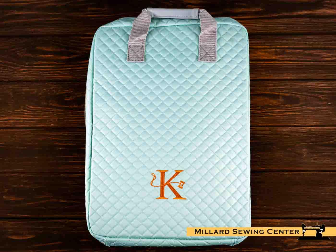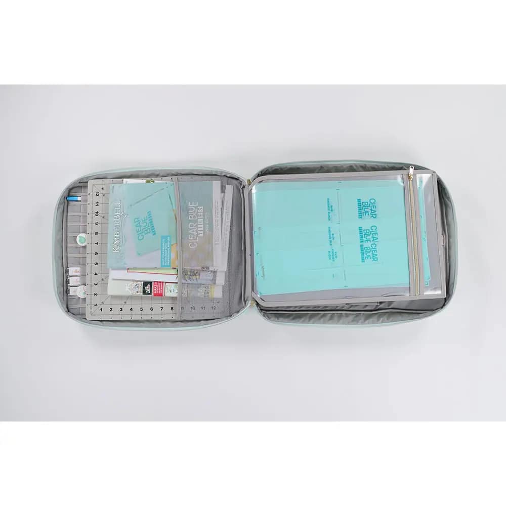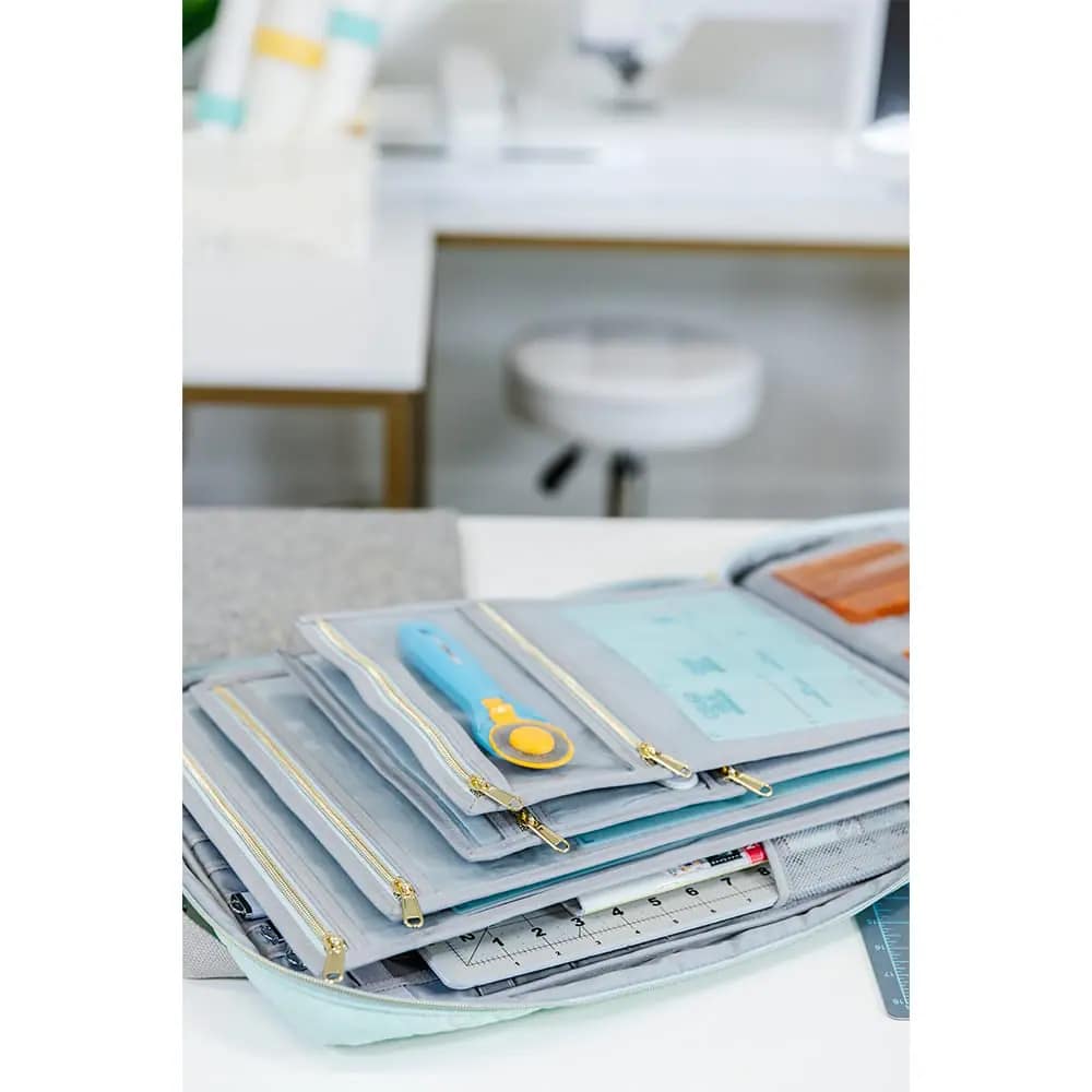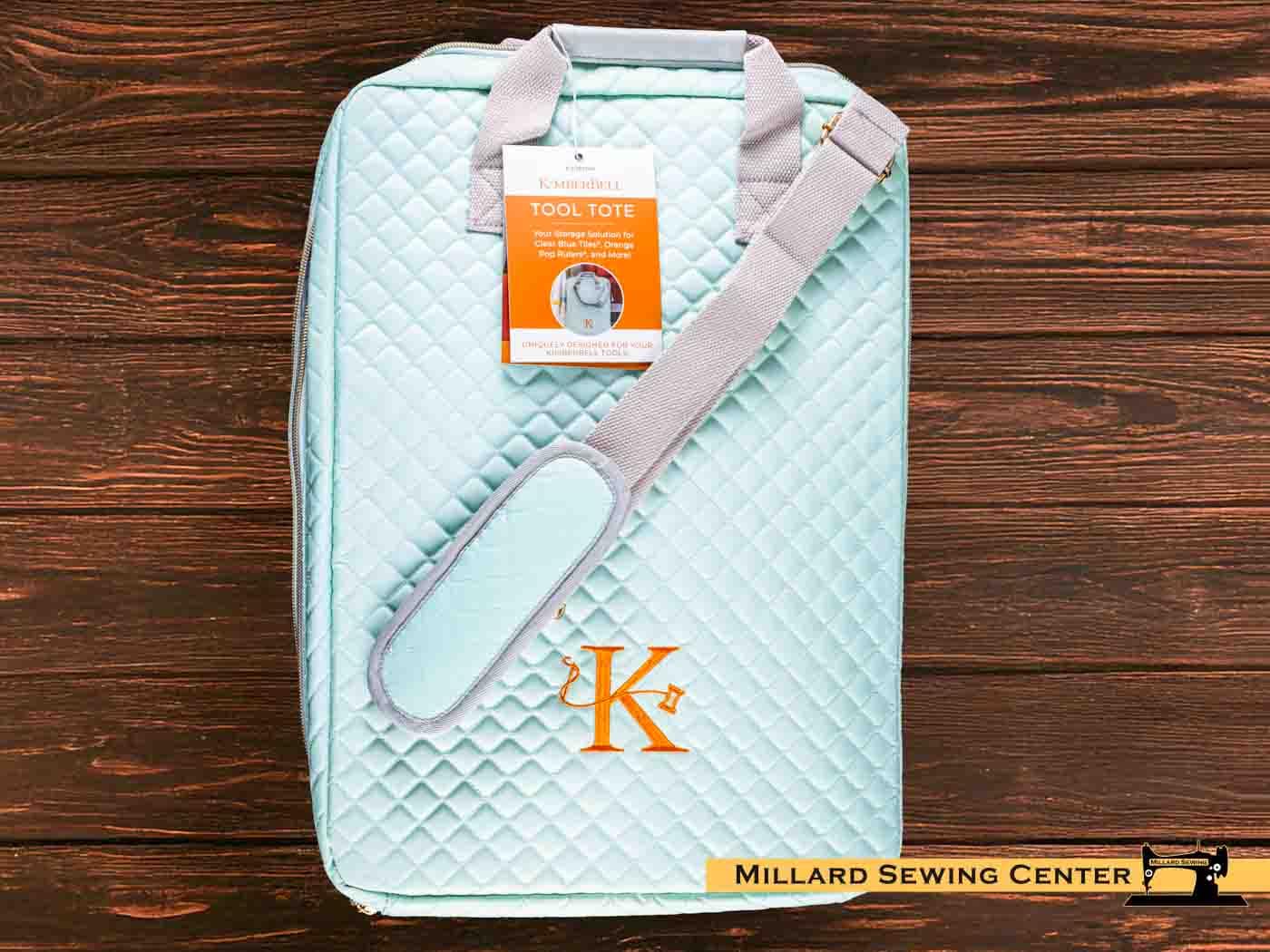 Store Clear Blue Tilesยฎ, Orange Pop Rulersยฎ, USB drives, and more in a Kimberbell Tool Tote! Our designer bag effectively holds your favorite Kimberbell tools, with 26 elastic slots for flash drives and expandable pockets for Orange Pop Rulers. A variety of clear vinyl pockets are perfectly sized for Clear Blue Tiles. Organize tiles by height, close the pockets, and zip with a beautiful gold zipper to keep everything safely contained! With a quilted exterior, sturdy handles, and a shoulder strap pad for premium comfort, the Kimberbell Tool Tote is your chic on-the-go storage solution!