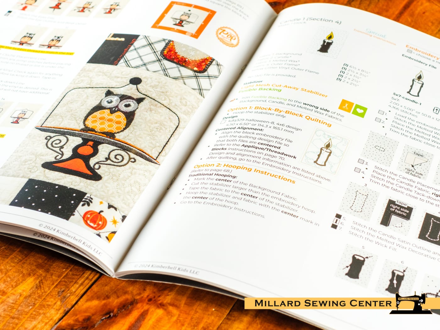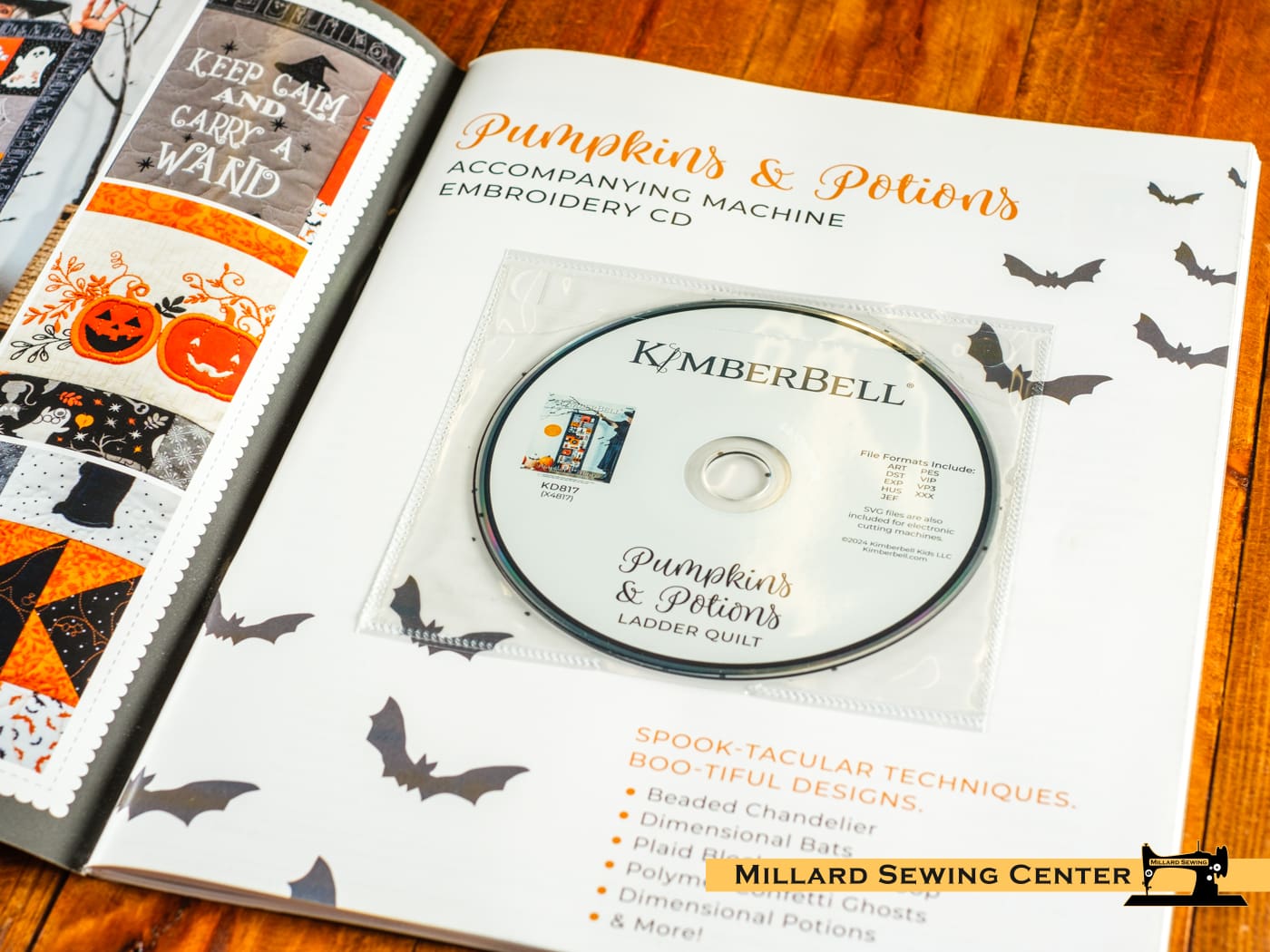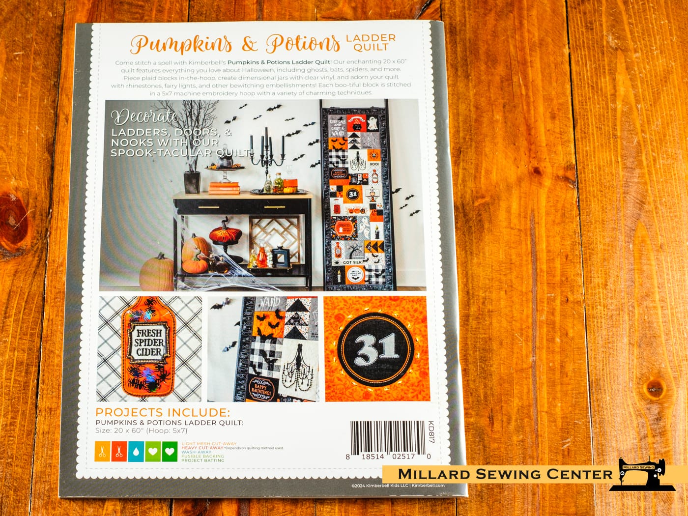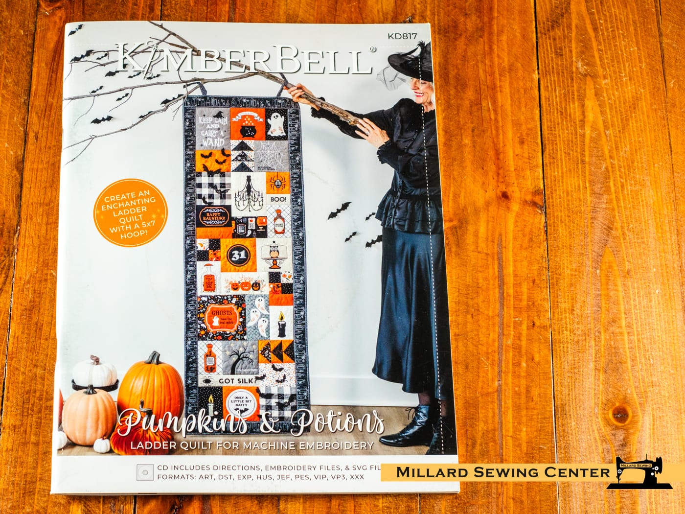 Come stitch a spell with Kimberbellโs Pumpkins & Potions Ladder Quilt! Our enchanting 20″ x 60โ quilt features everything you love about Halloween, including ghosts, bats, spiders, and more. Piece plaid blocks in-the-hoop, create dimensional jars with clear vinyl, and adorn your quilt with rhinestones, fairy lights, and other bewitching embellishments! Each boo-tiful block is stitched in a 5″ x 7″ machine embroidery hoop with a variety of charming techniques. From candles and cobwebs to each spooky sentiment, our Pumpkins & Potions Ladder Quilt is sure to raise your โspirits!โ Manufacturer Item No. KD817