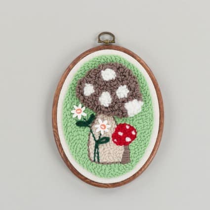 Add a bit of whimsy to your world with Kimberbell’s Mushroom Meadow design! Our Punch Needle Plus kit includes all the supplies you need to completely finish your project, including the tool, monks cloth, yarn, frame, embellishments, and video tutorials. Punch two charming toadstools, add tiny flower buttons, and frame in our faux wood oval frame!