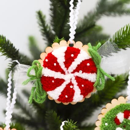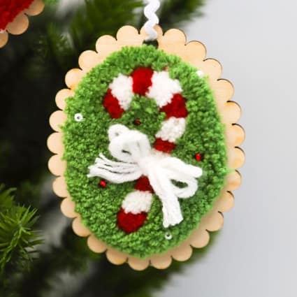 Create four Cozy Christmas Ornaments with Kimberbellโs Punch Needle Plus kit! Your kit comes with everything you need to completely finish four darling ornaments: Candy Cane, Gingerbread Man, Tree, and Peppermint. Punch each design in a 5โ hoop, add a variety of merry embellishments, then trim and attach to scalloped wood disks with rick-rack loops!
