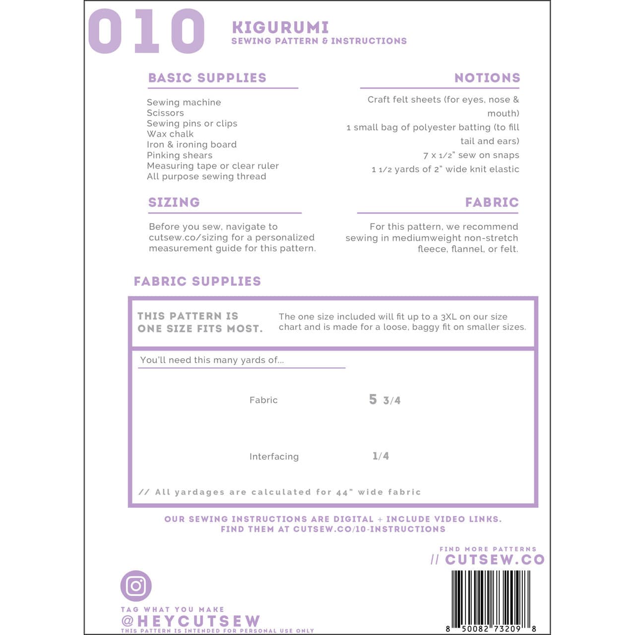 This super comfy kigurumi pattern includes a free-sized pajama onesie which can fit up to a 3XL body. It features a customizable hood with options included for a cat, rabbit, and bear, and the body features a snap center front closure and elastic cuffs on the wrists and ankles. Our included instructions offer tips and tricks on how to customize the hood and tail for just about any animal or character, so it can be used for both specific cosplay or just comfy pajamas. Out of the package this pattern is intended to fit up to a 5′ 8″ tall body, but can be modified for taller bodies using the included adjustment instructions.