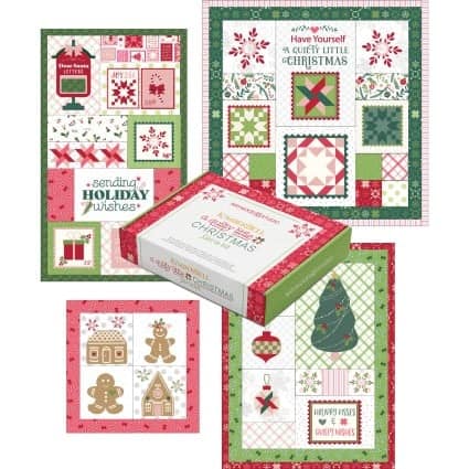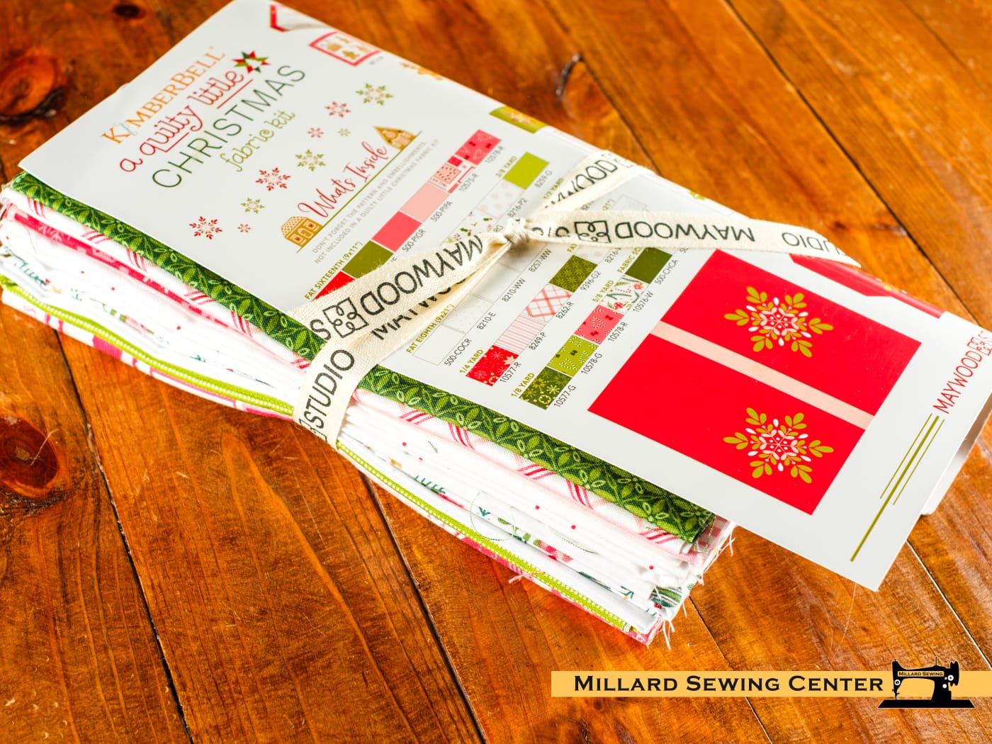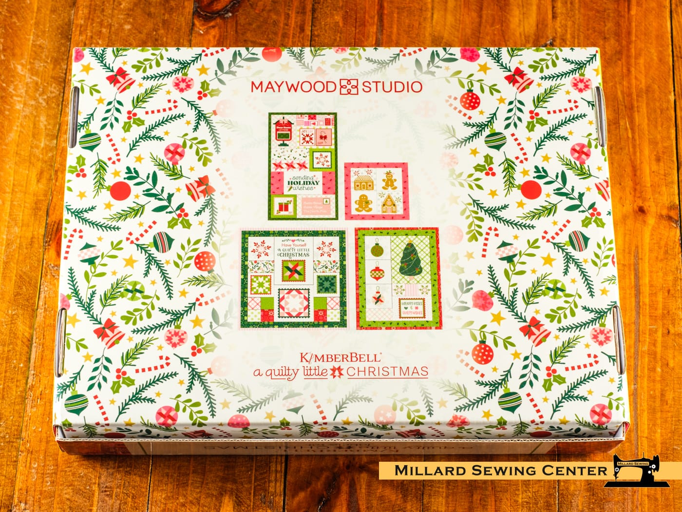 Have yourself A Quilty Little Christmas! The Maywood Studio A Quilty Little Christmas fabric kit in a collectible box includes all the fabric you need to make the four small gallery wall quilts: 10 x 10โ Gingerbread Cookies, 12 x 16โ Quilty Wishes, 10 x 18โ Sending Holiday Wishes, and the 16 x 16โ A Quilty Little Christmas. Backing and binding are included. The kit features fabrics from these Kimberbell collections: A Quilty Little Christmas, Celebration, Kimberbell Basics, and Kimberbell Solids. Pattern and embellishments are sold separately.