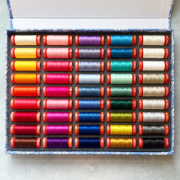 Aurifil X Liberty is a luxurious 45-spool thread collection that unites Aurifilโs renowned Italianย craftsmanship with Libertyโs iconic British design heritage. Presented in a Liberty fabric-wrappedย collectorโs box featuring the beloved Emily Belle florals in Marine Blue, the set includes 45 smallย spools of Aurifilโs 100% Cotton 50wt thread, each shade carefully curated to coordinate seamlesslyย with Libertyโs timeless palette. Perfect for quilting, garment sewing, or embroidery, this collectionย is both a makerโs essential and a true keepsake โ a celebration of color, creativity, and the joyย of stitching.