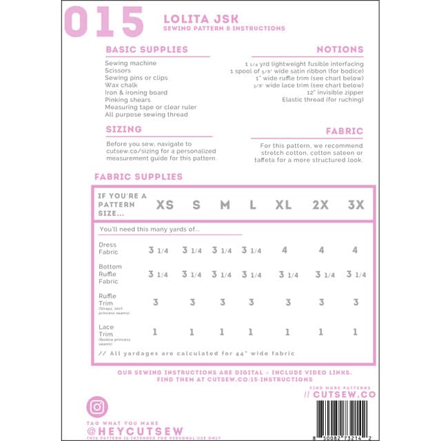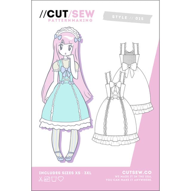 This basic jumper skirt dress is inspired by Lolita street fashion and includes a shirred back, side invisible zipper, and two-tiered skirt ruffles. Easy to customize with the lace, trims, and ribbons of your choosing, this pattern allows you to mix and match the decorative pieces included like bows and ties to fully customize it to your own style. For maximum fullness, we recommend a petticoat with this dress.