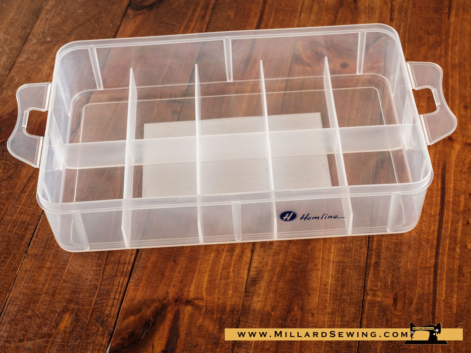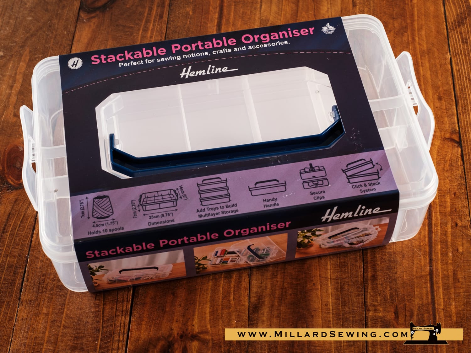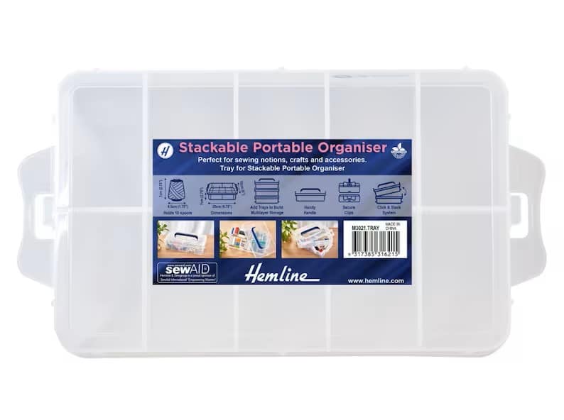 Hemline Stackable Portable Organizer- Tray and Lid Set. Hemline Stackable Portable Organizer Perfect for sewing notions, crafts and accessories. Strong and sturdy PP clear plastic material Built-in 10 permanent compartments. You can insert trays (M3021.TRAY) to build multilayer portable storage. Handy foldable handle and click and stack system with secure clips. Holds 10 thread spools. The tray has 10 built in compartments.