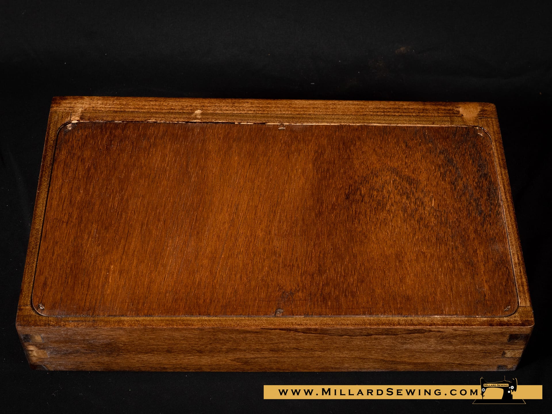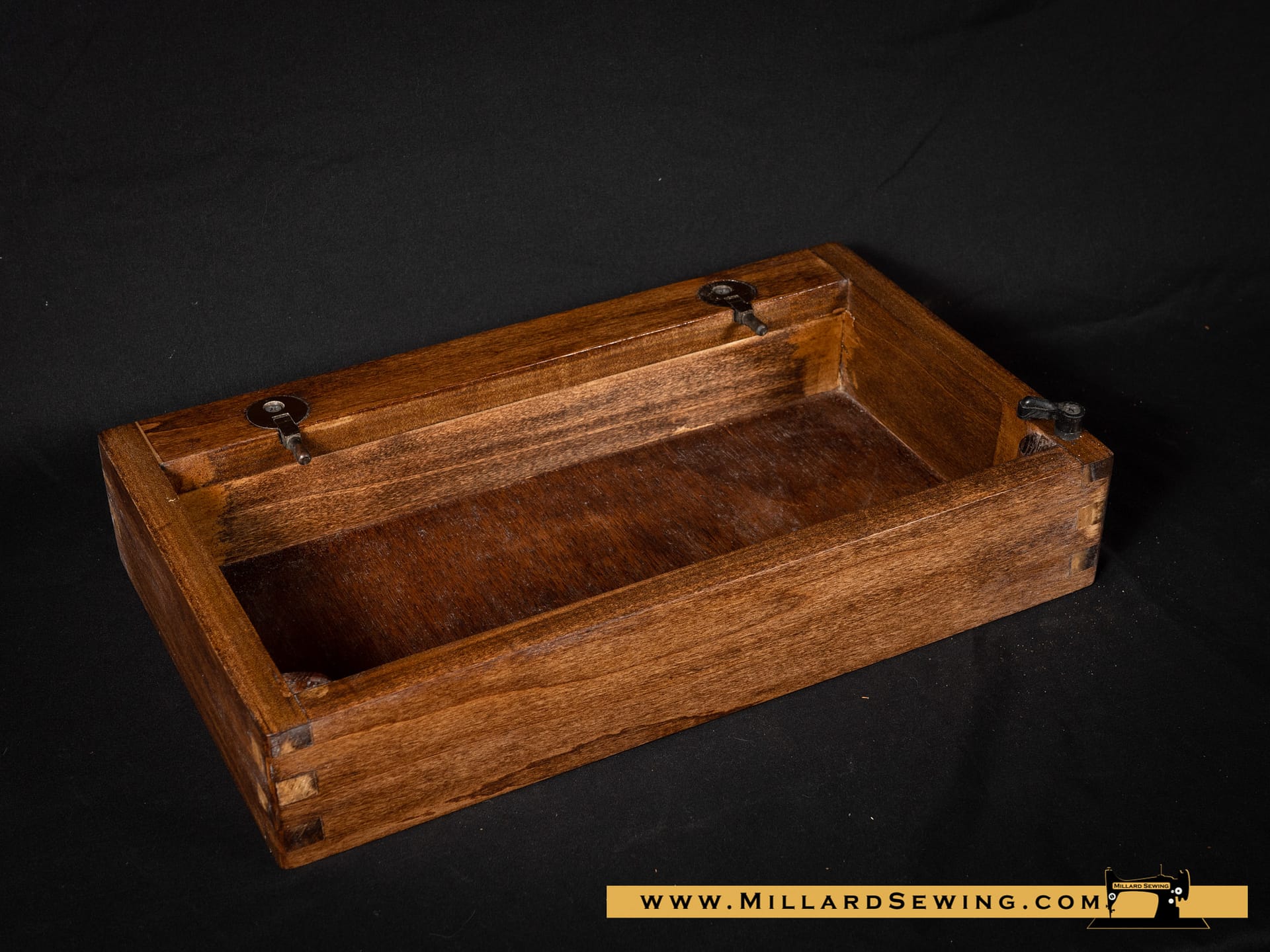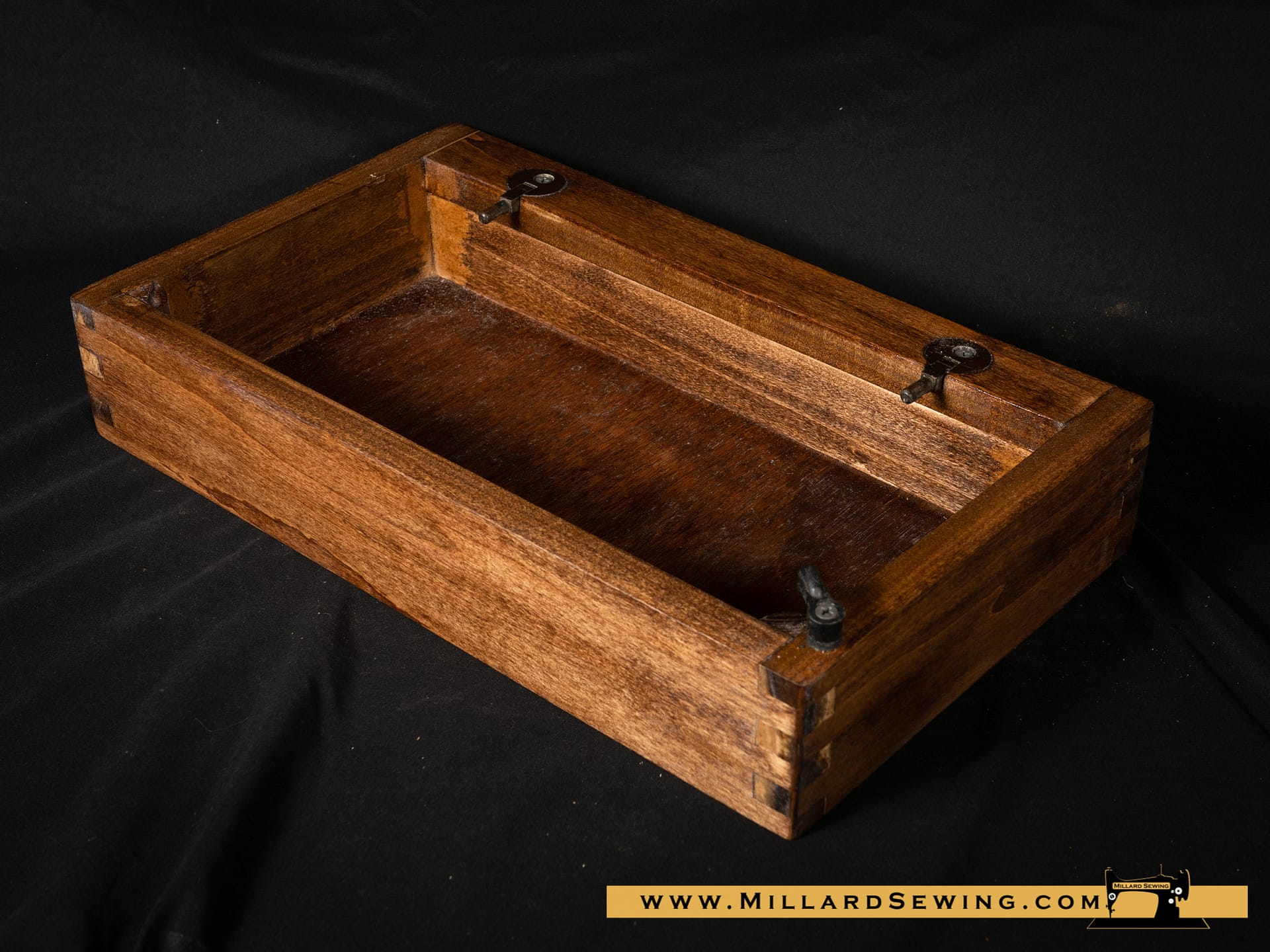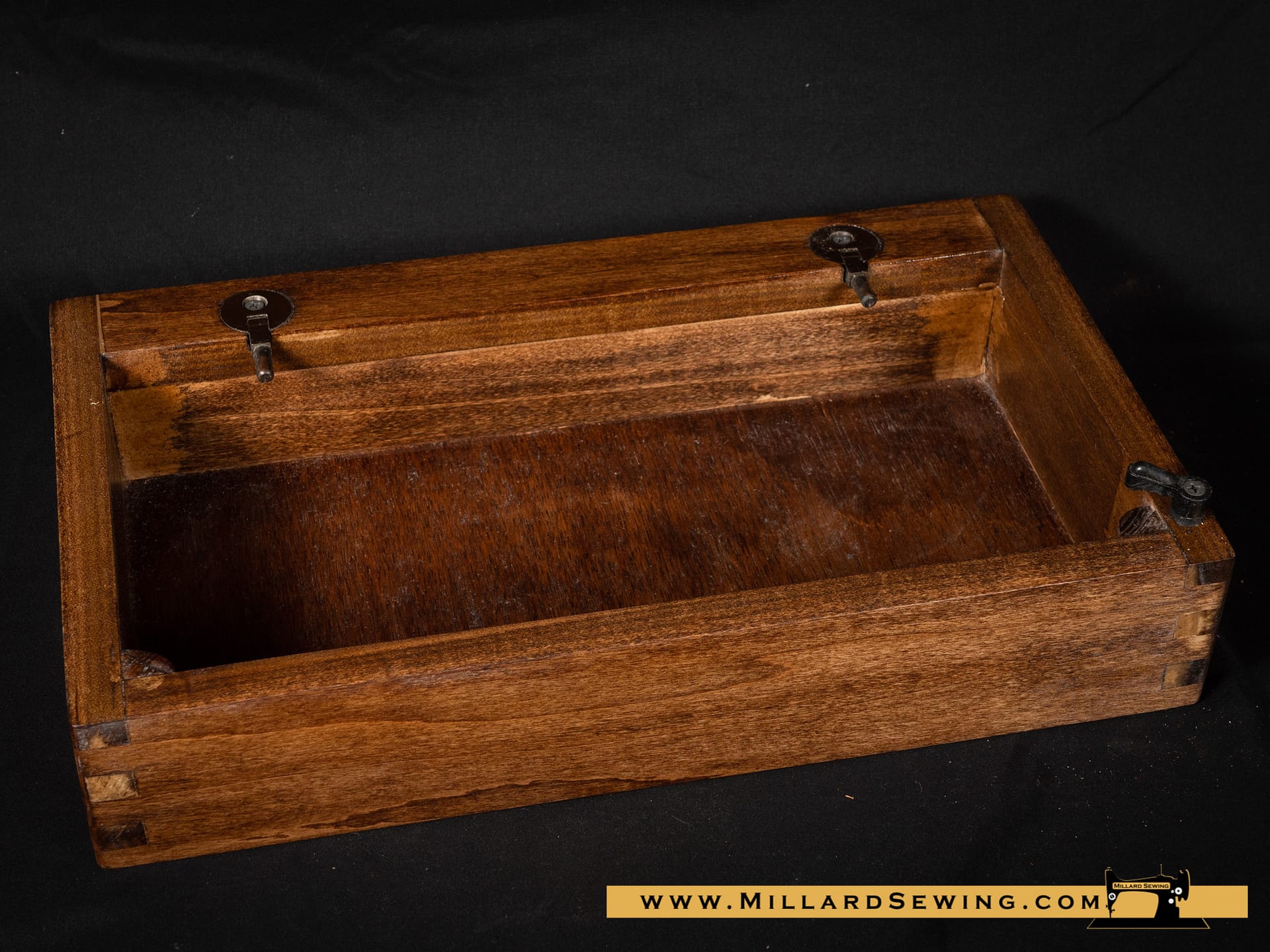 Every Sewing Machine needs a home. Sometimes a cabinet makes the most sense and sometimes a base does. The problem is after all these years many of the original wood bases have lost a battle or two when the machine was shipped or transported. We have now made a few of these and have come up with a formula that we are happy enough with to offer these for public sale. They are being constructed out of Poplar wood and will be stained to your color of choice (within reason). The pocket on the side is available in custom sizes to fit the foot controller, your accessories or both! The hinges are vintage cabinet style hinges just as pictured. They can be made for both 3/4 size and full size machines and can even be made for the shorter shuttle bobbin machines if you need.