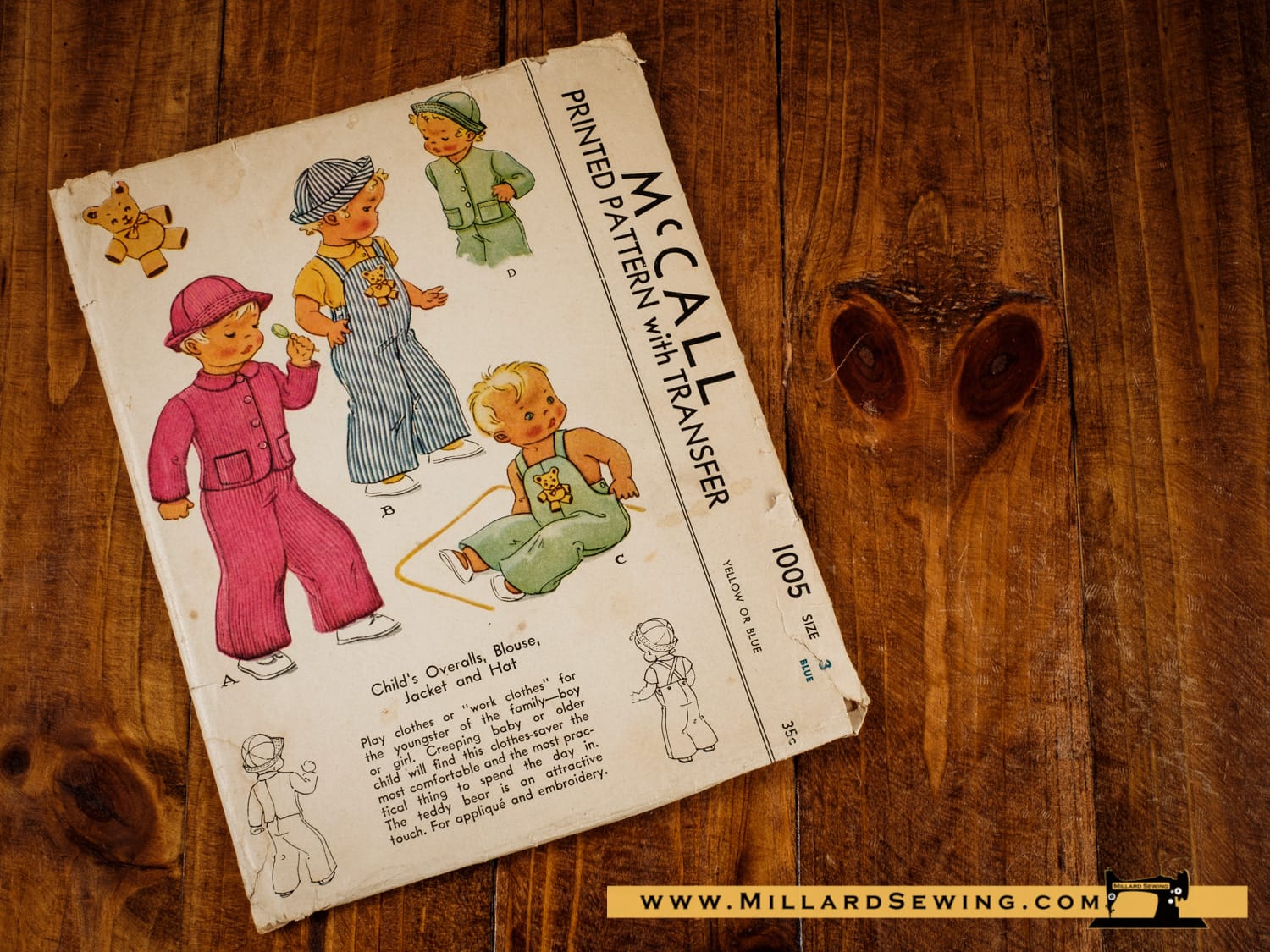 McCall’s (Cut). Size 3. Vintage 1942 children’s overalls, blouse, jacket and hat.