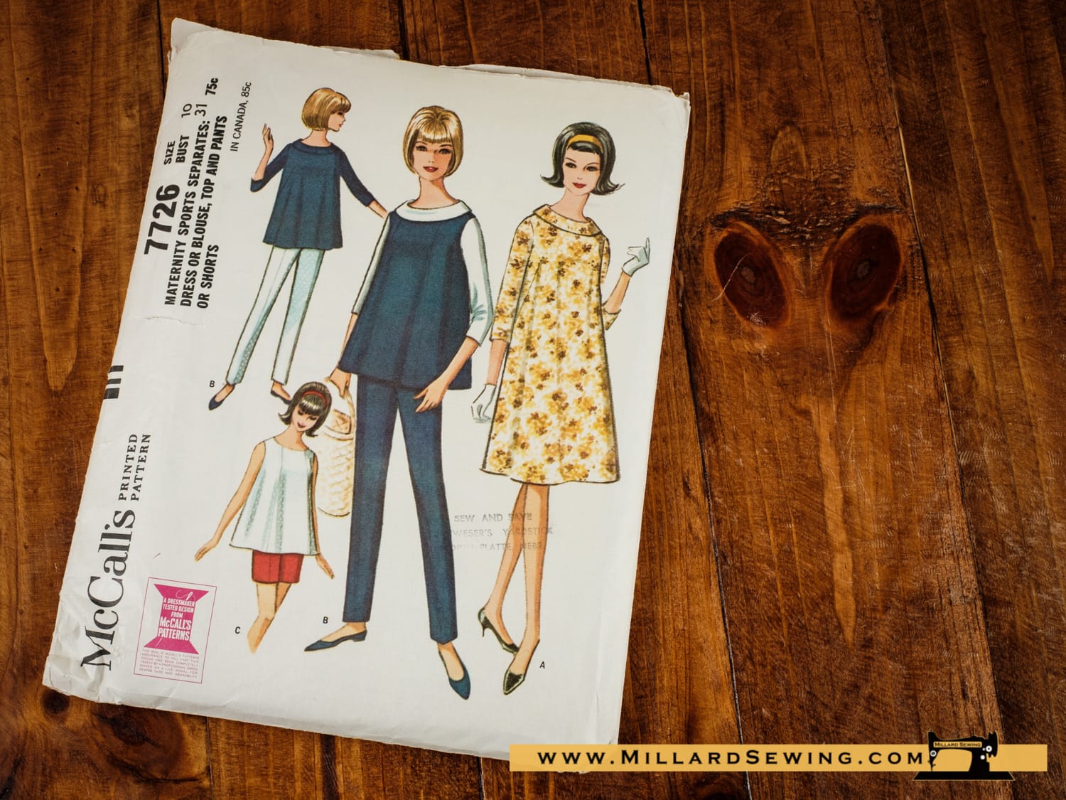 McCall’s Maternity 7726 (Cut) Size 10. Vintage 1965 pattern for dress or blouse, sleeveless top, and pants.
