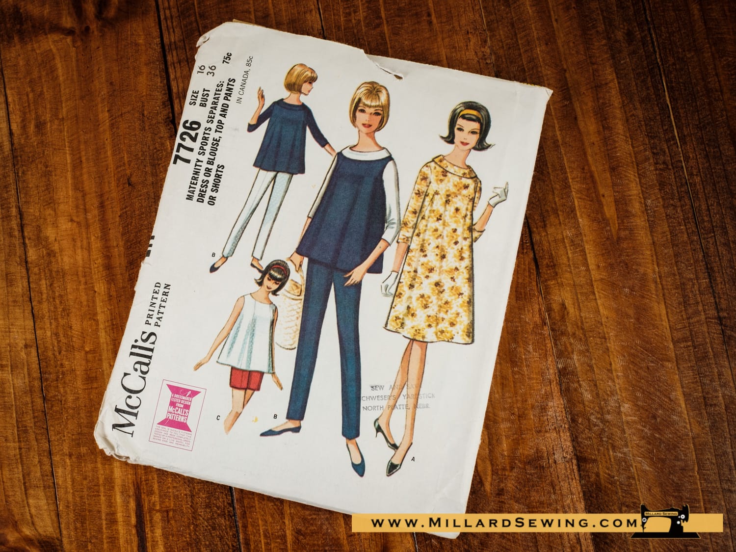 McCall’s Maternity 7726 (Cut) Size 16. Vintage 1965 pattern for dress or blouse, sleeveless top, and pants.