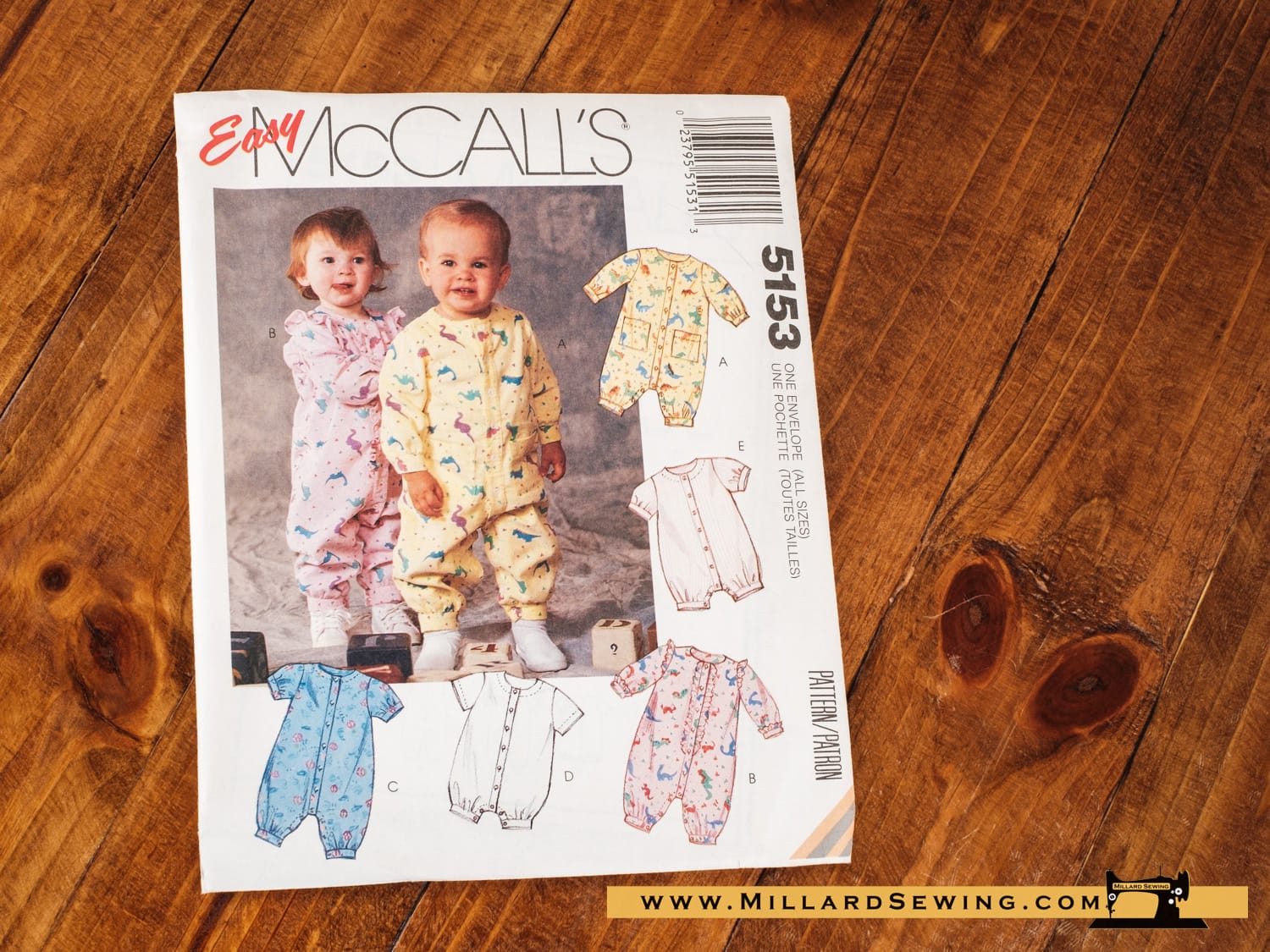 Infants Jumpsuits and Rompers with front button r snap closure, sleeve variations, snap crotch opening with and without patch pockets.