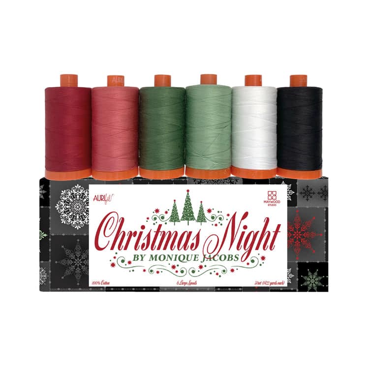 Snowflakes swirl around wintery evergreens as we put the final touches on the gifts and decorations for our holiday celebrations.Christmas Night by Monique Jacobs for Maywood Studio is an elegant holiday collection filled with stylish motifs in rich reds, greens, and blacks. Wrap up the seasonโs festivities with patchwork and projects that will be part of your Christmas Night celebrations for years to come. Six Large Spools of Aurifilโs versatile 50wt thread were selected to perfectly complement these festive fabrics.