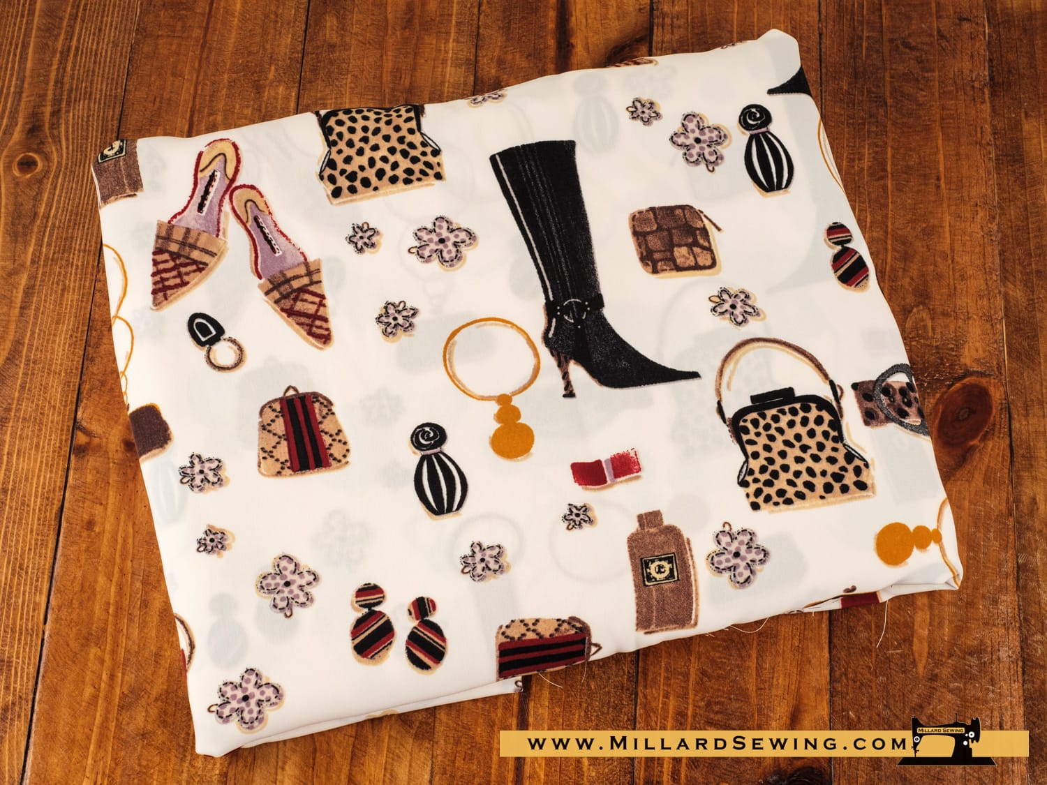Light weight woven fabric in shoes and accessories print. Browns, Maroon and Gold. 3 yards.