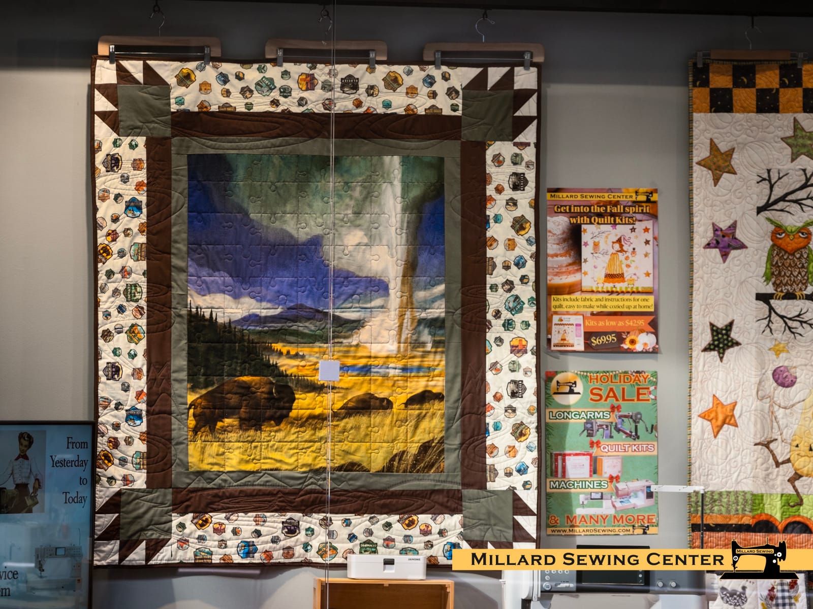 Because our project was done on the longarm, we had marked out the location of where the borders of the panel were.ย This allowed us to let the longarm stitch the puzzle design on only the panel part of the quilt.