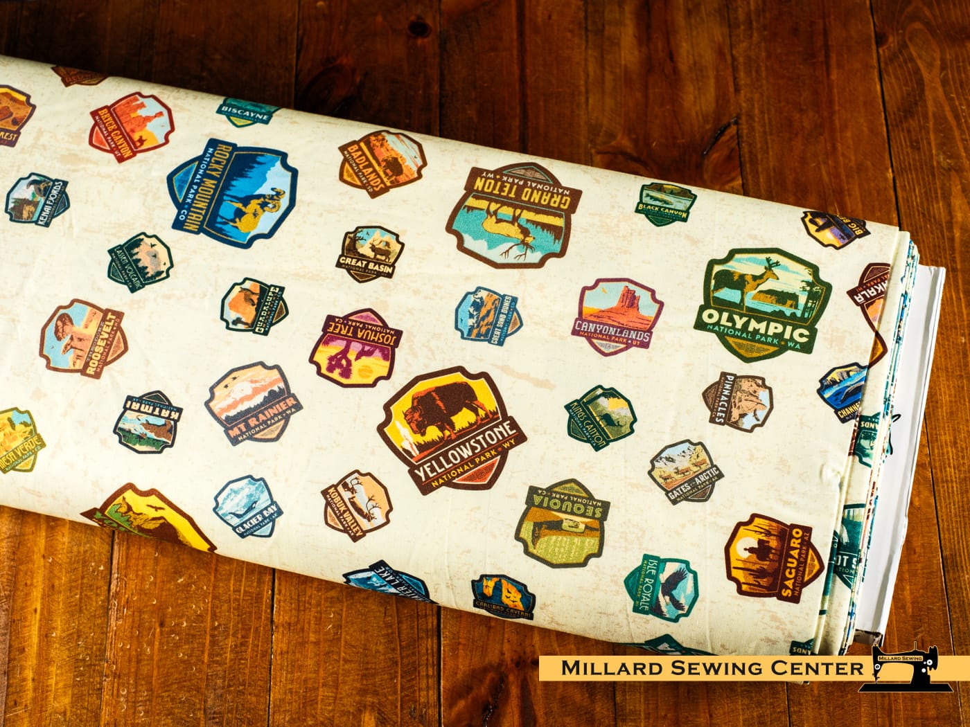 | We used select Riley Blake Confetti Cotton Solids for the strips and bear claws. The main focal point of the Quilt, we used the Wilderness & Wonder in Yellowstone by Riley Blake Designs. For the backing and some of the square pieces, we used the National Parks in Cream by Riley Blake Designs. |