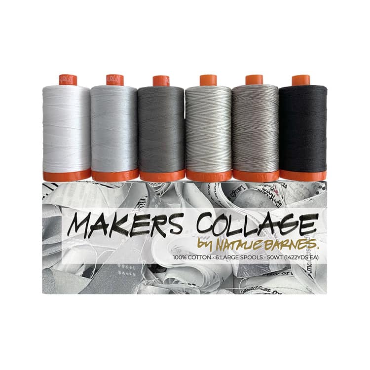 Natalie Barnes, of beyond the reef patterns, has created a collection of bright neutrals, ideal for any modern makerโs studio. Curated to coordinate with her new fabric range (Windham Fabrics), Makers Collage is a tried and true blend of bright whites, cool grays, and a soft black, all in Aurifilโs versatile 50wt cotton. These are the threads that youโll reach for project after project, quilt after quilt.