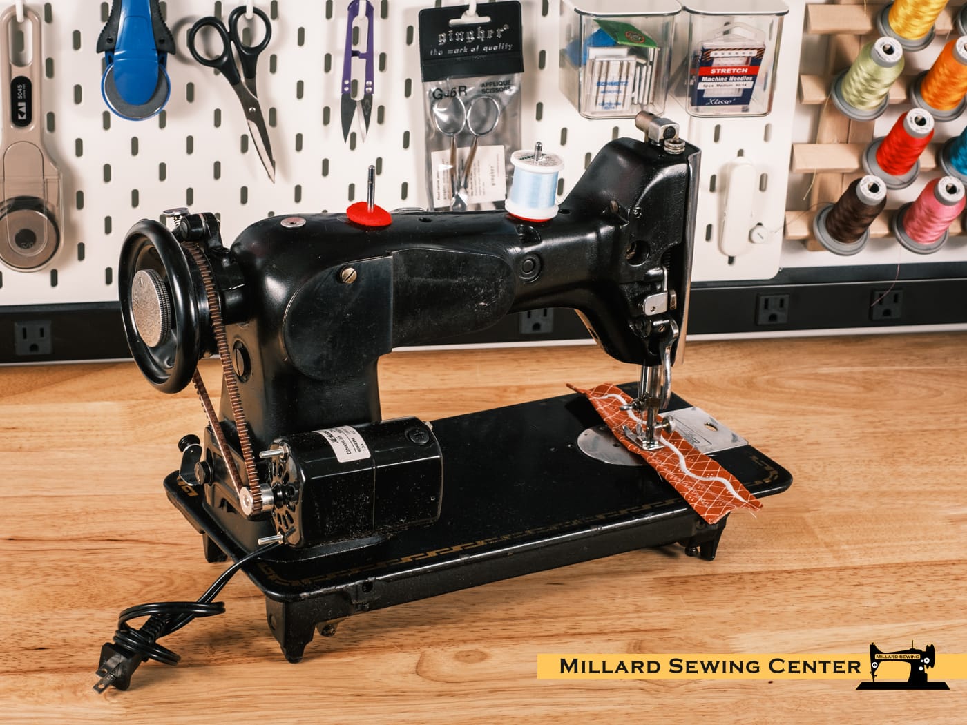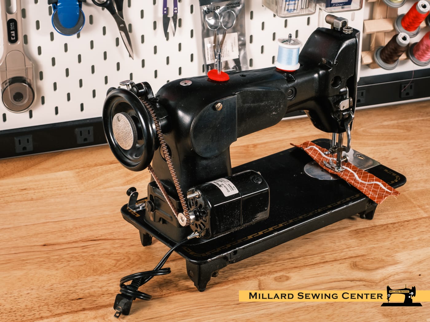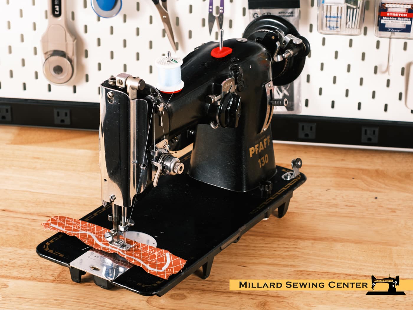 This machine has enjoyed a life of use and it’s finish shows it.ย The graphics are worn away at the usual places on the flat bed sewing surfaces and it has crazing and some paint chips.ย Of course none of that effects this machines ability to sew. It has been outfitted with a new Alphasew 1.5 amp motor, as well as a new foot controller and lead cord to make the most of the Pfaff’s abilities.ย Like all of our machines, it has been thoroughly gone through and serviced to ensure stitching perfection.