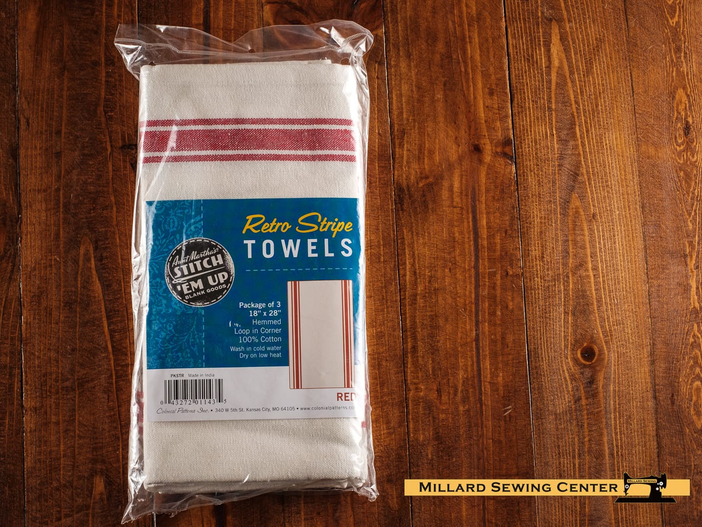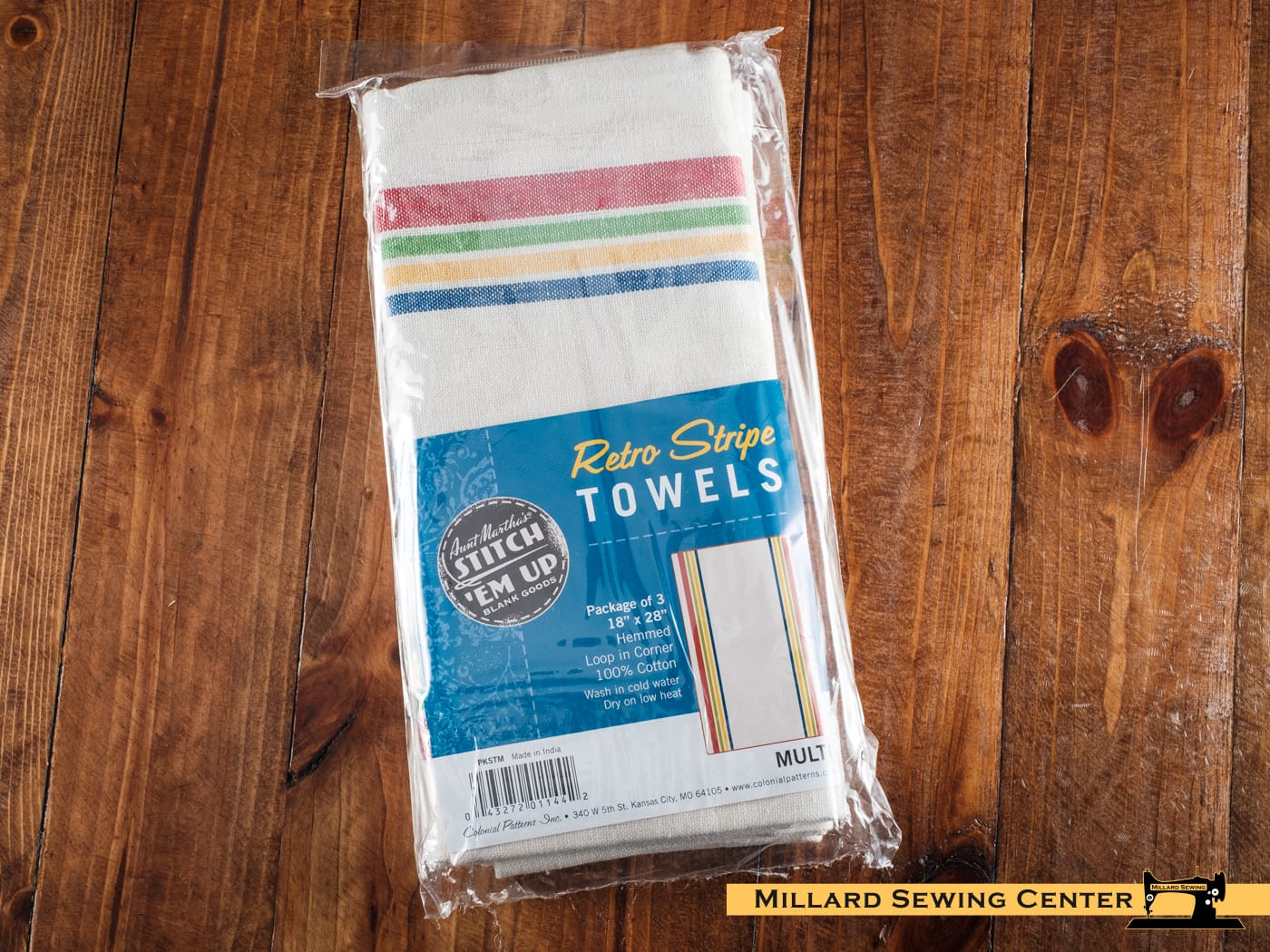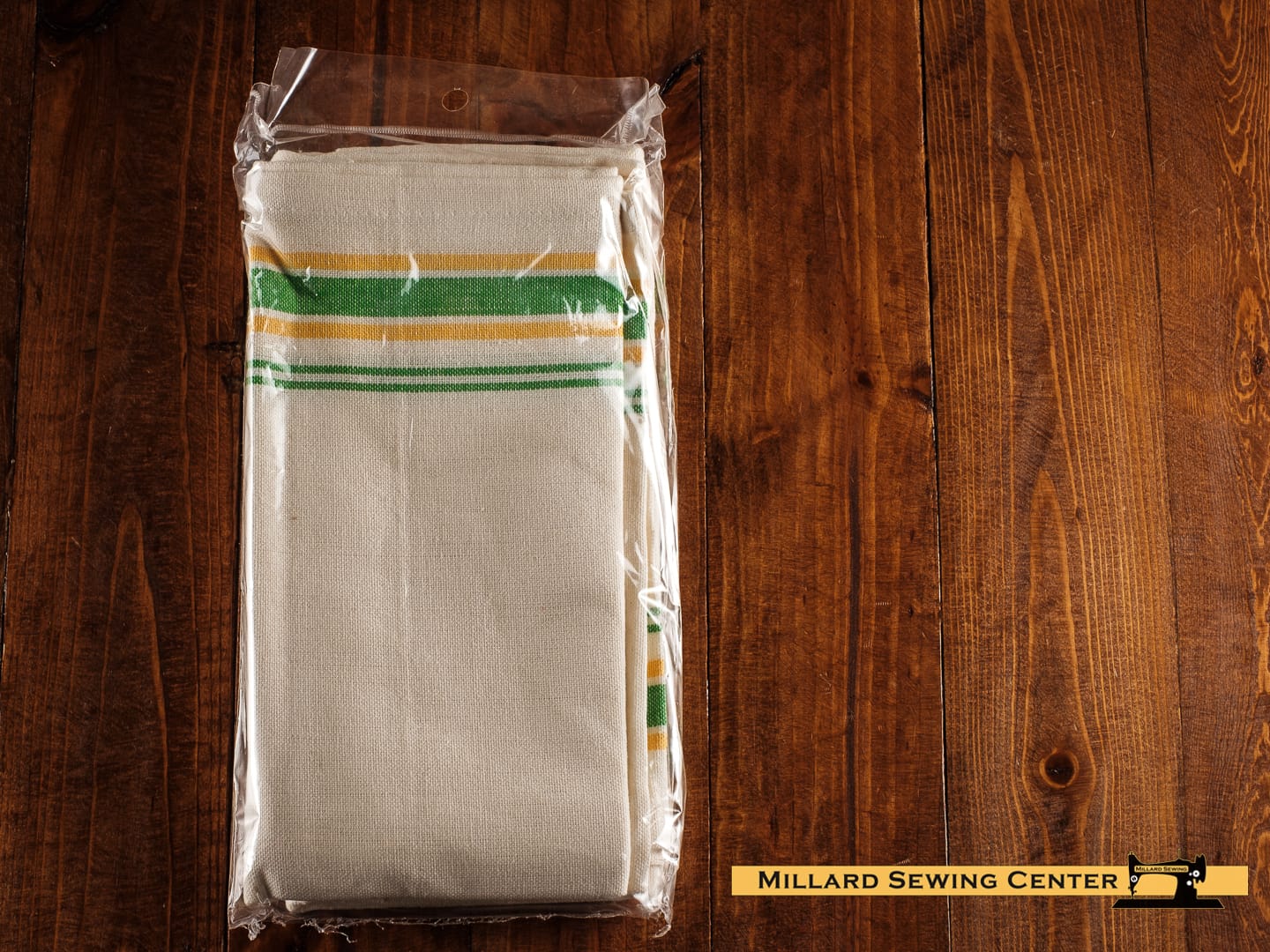 Made from a 100% plain-woven cotton with a 4-sided hem and a hanger loop sewn in the corner.ย Stripes run along the long side of towel.ย Towel measures 18×28 inches. Wash in cold water; dry on low heat; some shrinkage will occur.