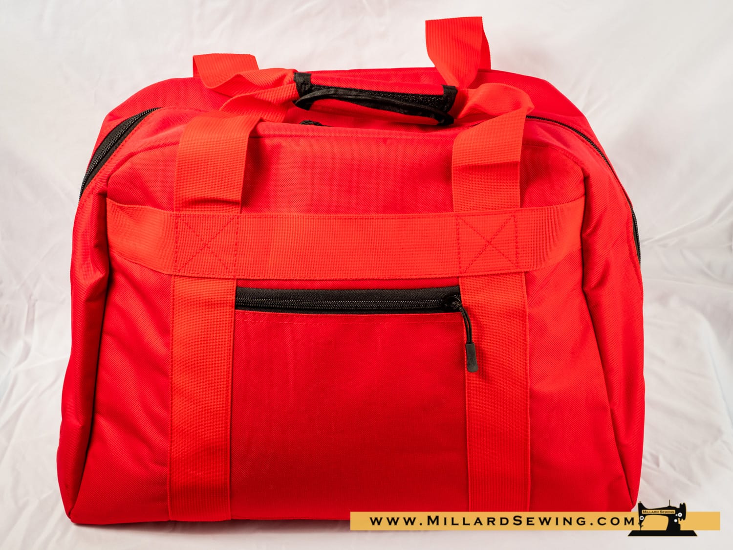 Red nylon and canvas tote bag for free arm sewing machines with inside pad. Nylon webbing and double zipper closure.