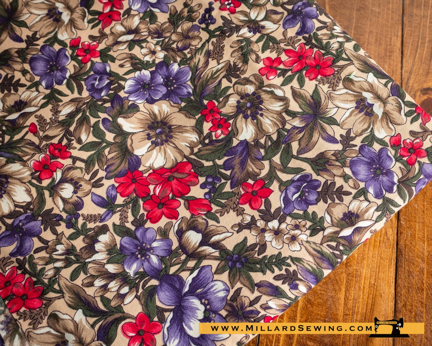This is a cotton fabric remnant, purple, red and tan flowers print on a tan background. This is the Countryside Collection by Hoffman International Fabrics, screen print.