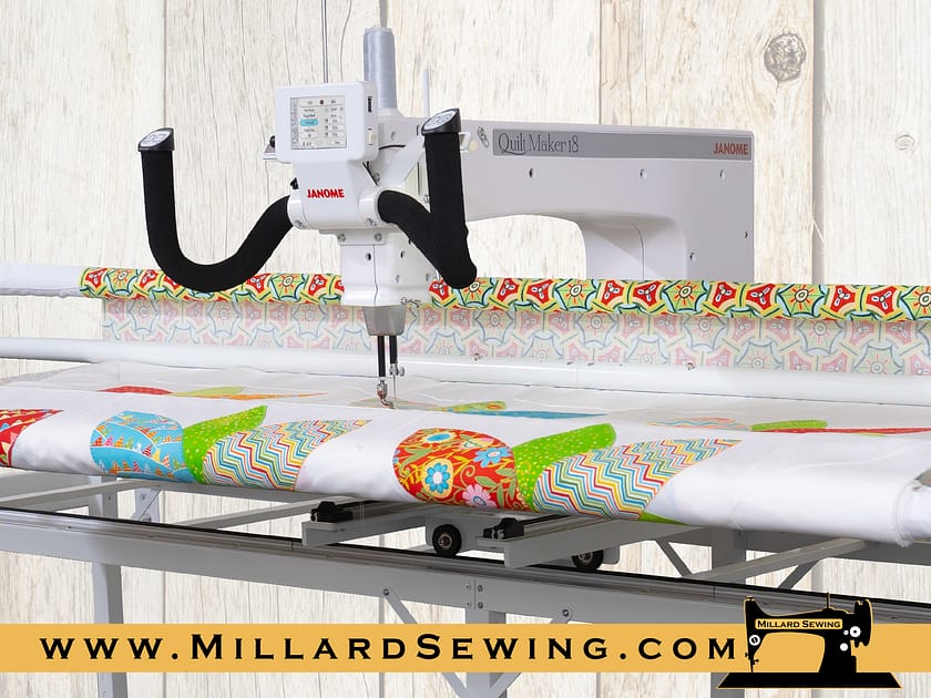 The Janome Quilt Maker 18 provides 18 inches of free motion freedom in this long arm quilting machine. No more basting with pins or struggling to cram a quilt under a domestic machine. Get stitching quickly with the easy-to-use straightforward features, easy-to-use controls, and the space to reach your full creative potential.