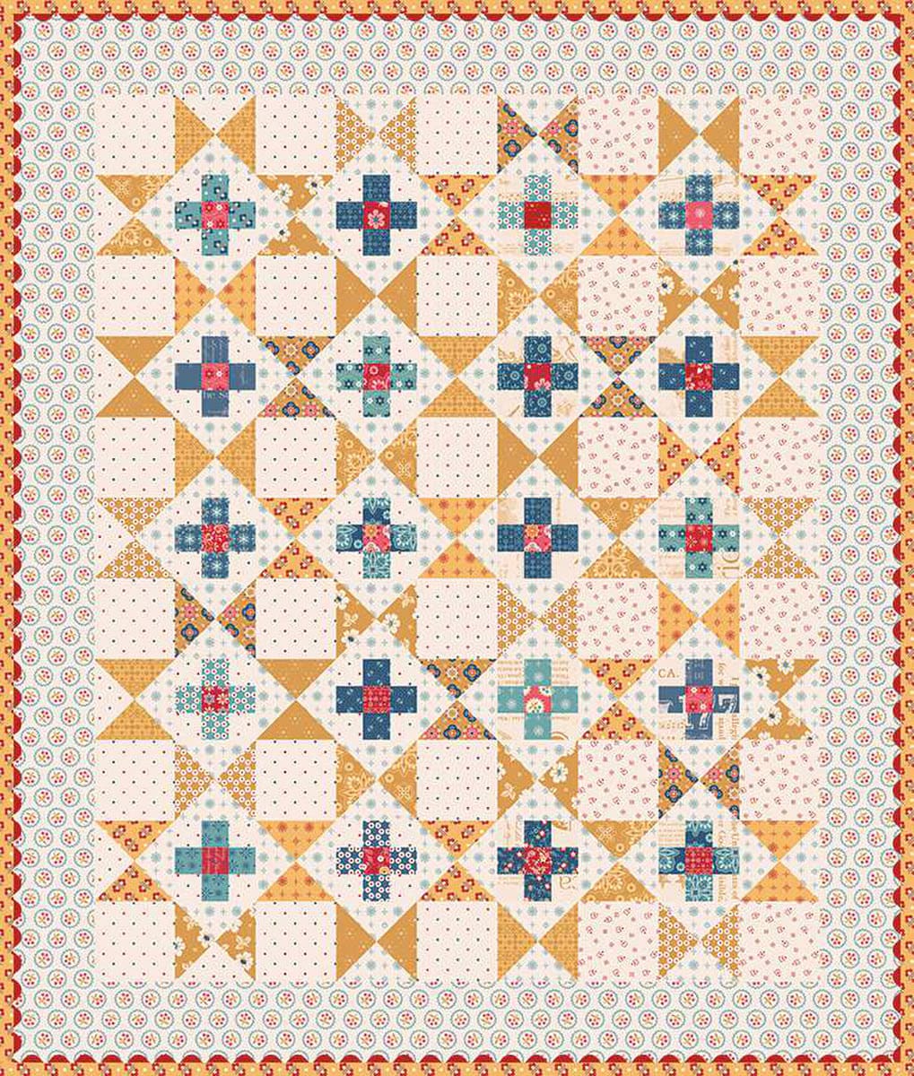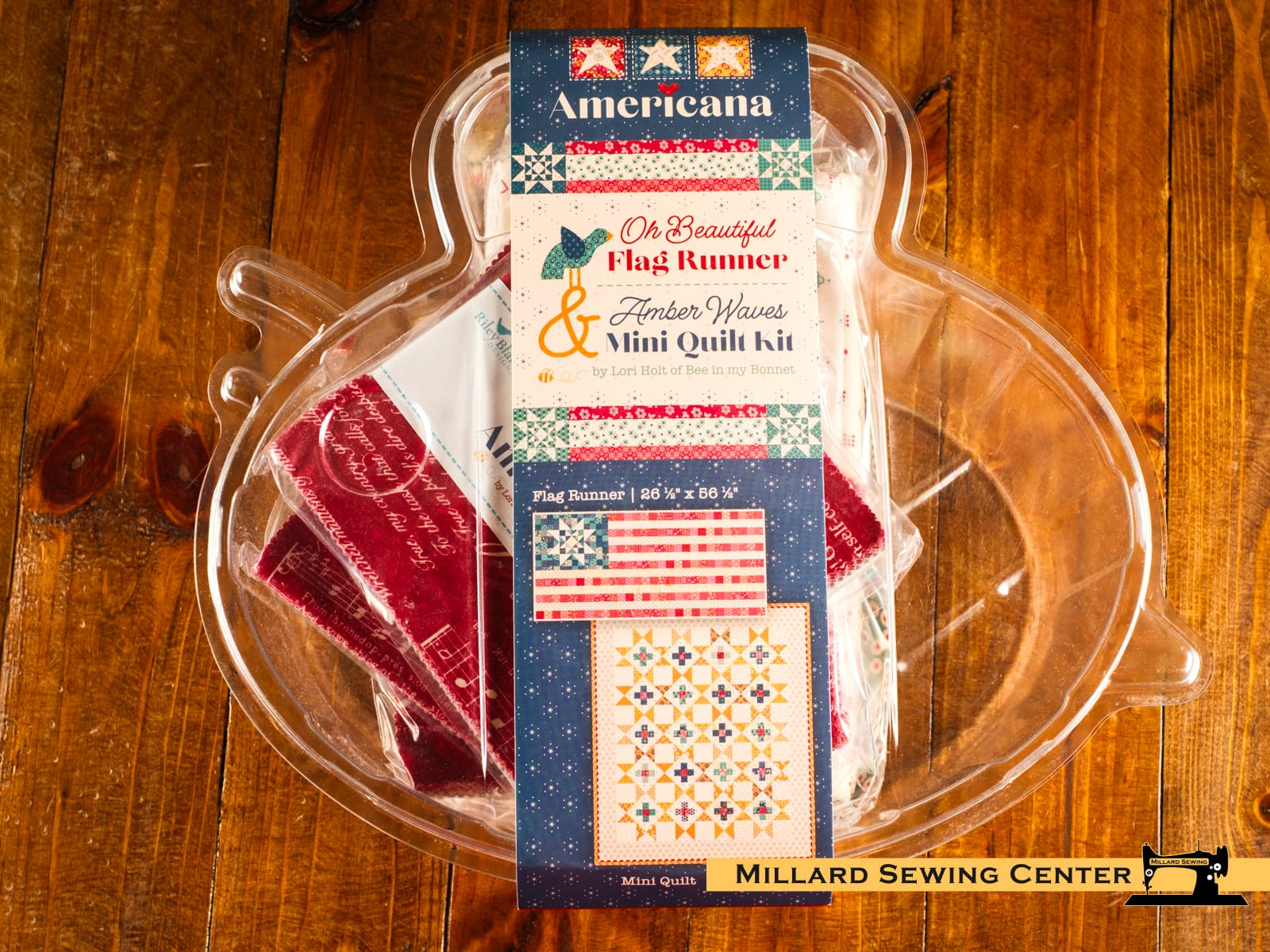 The Oh Beautiful Flag Runner & Amber Waves Mini Quilt Kit includes pattern and fabric for runner and quilt top and binding. Backing and optional vintage trim is not included. Fabric featured is Americana by Lori Holt of Bee in my Bonnet. Pattern is also by Lori. Finished runner size is 26″ x 56″. Finished mini quilt size is 33″ x 39″. Kit comes in a Bee Cute Project Box. Box size is approximately 10″ x 9 1/2″ x 3″.