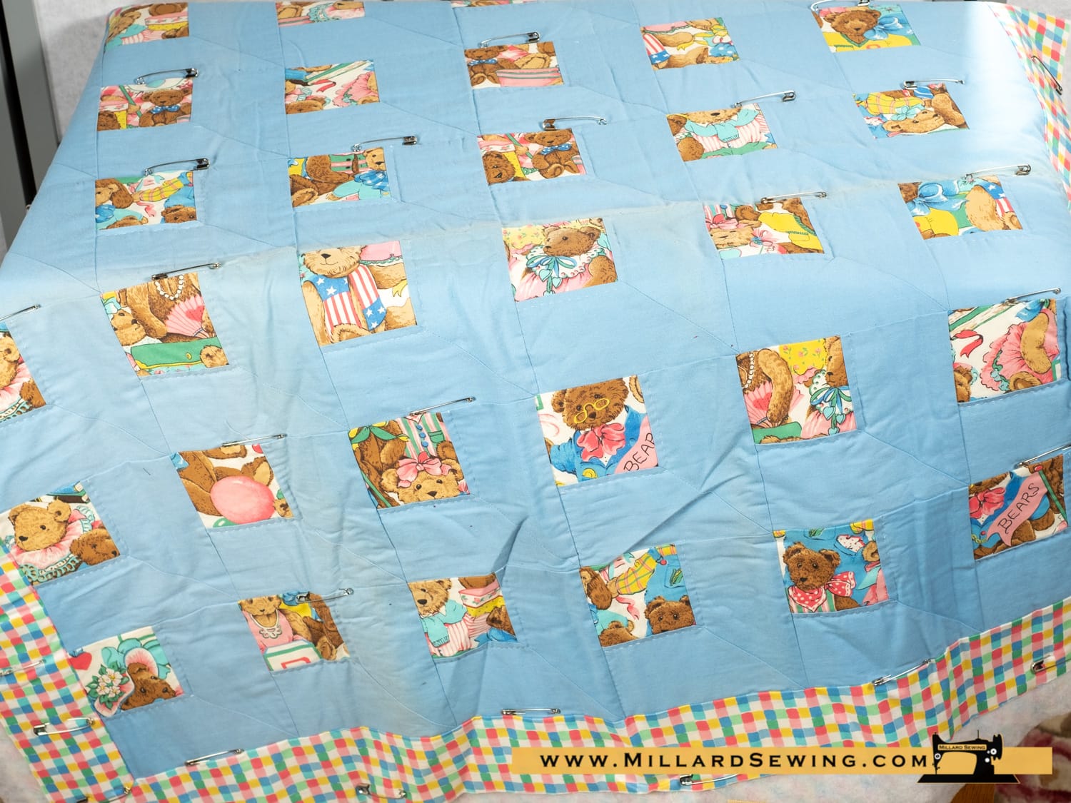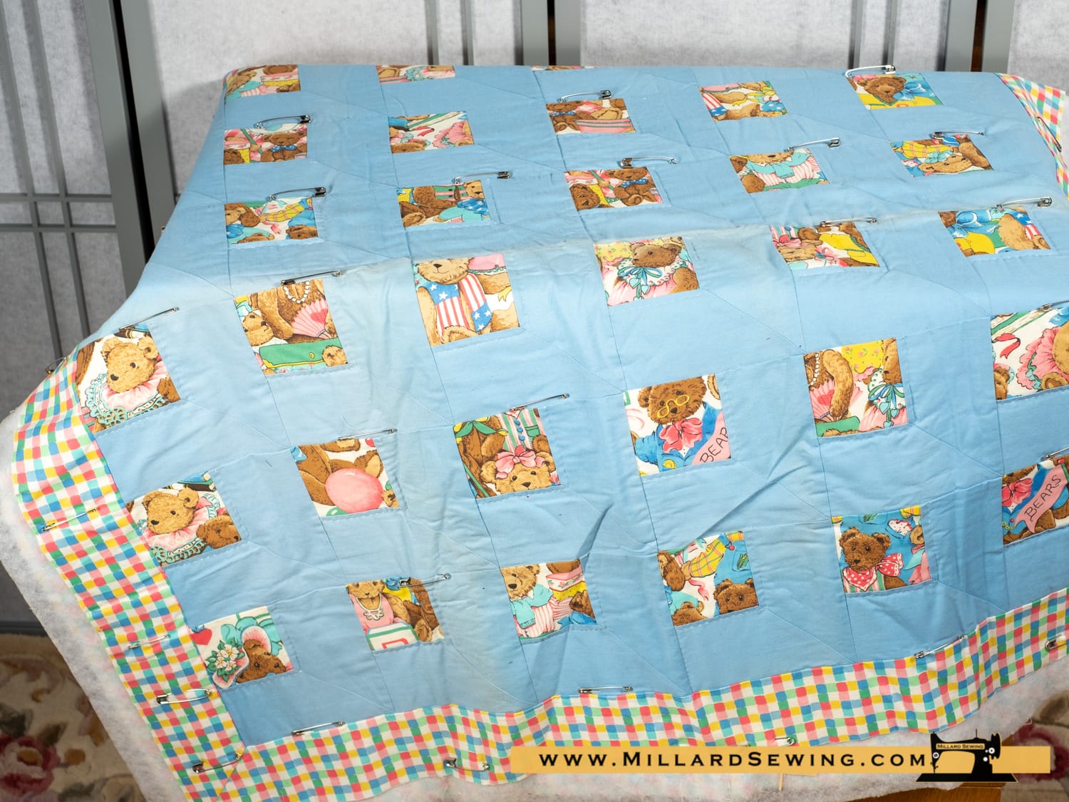 This is a solid cotton quilt top ready for it’s next step to finish it up. It’s a baby quilt top that needs to be finished. It has a beautiful boarder, blues, greens, pinks, yellow and white checkers. There are Teddy Bear blocks through out the quilt and baby blue blocks as well. Part of the quilt was hand quilted. Just needs the bottom sewn and boarders sewn. The bottom fabric matches the board.