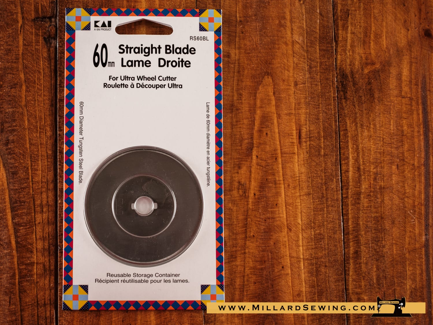 The KAI RS60BL – 60 mm rotary blade is made of tungsten steel.ย The tungsten steel alloy allows the RS60BL to cut through virtually any sewing or quilting fabric precisely and smoothly.ย As with allย our KAI rotary blades; they will fit many other brand’s rotary cutters.