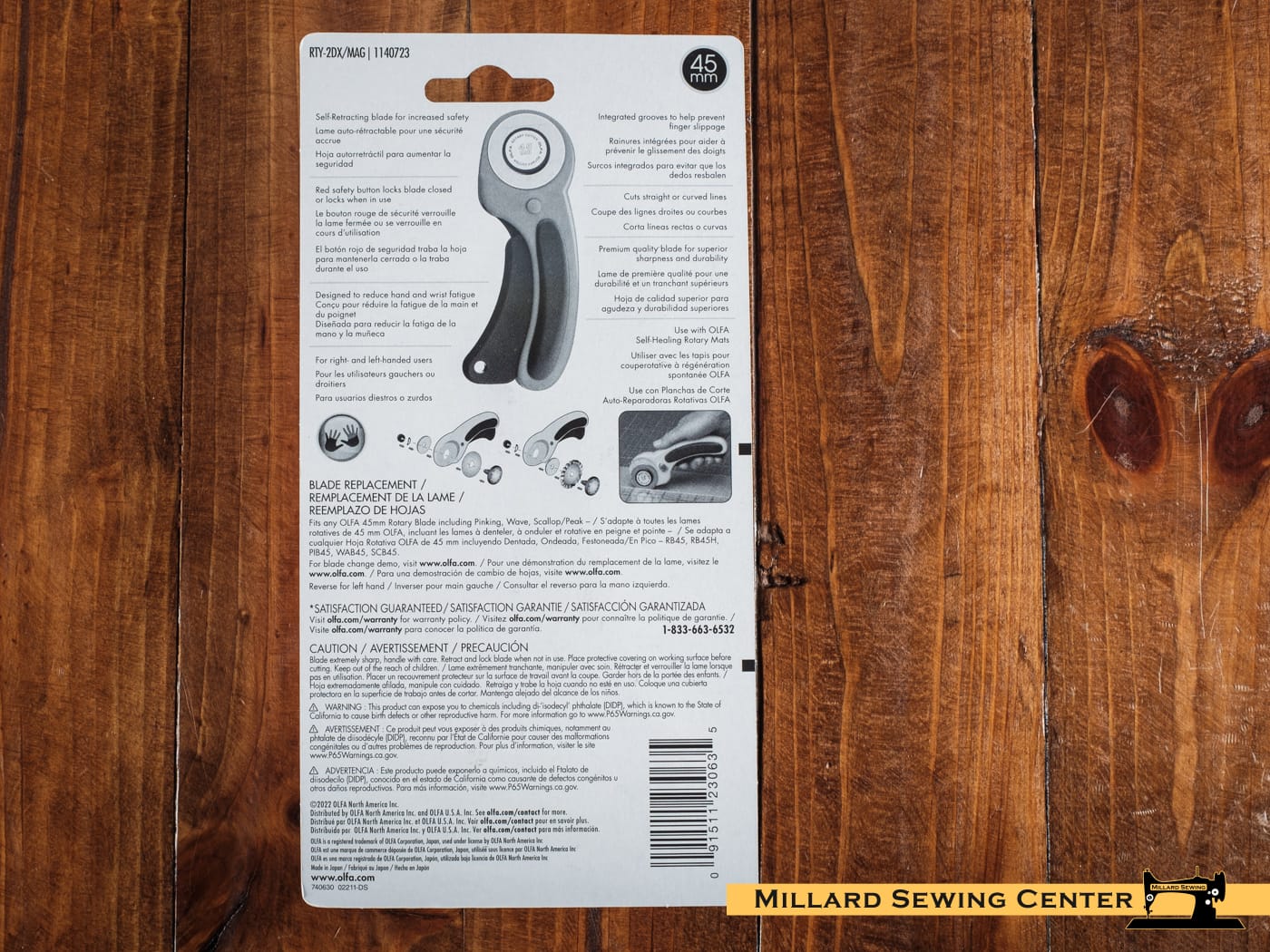 The OLFA 45mm Ergonomic Rotary Cutter shows many design features that make cutting jobs comfortable and safe.