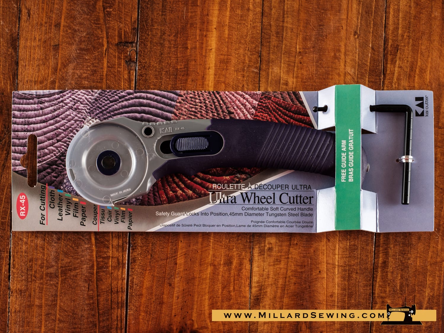 The KAI RX-45 a 45mm Rotary Cutter features a convenient slide-open blade design, where the blade is released and contracted via a slide lever along the handle. It also has a universal grip for right or left-handed use, and includes a guide arm that makes adding seam allowances an easy chore.