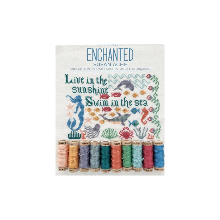 Get ready to be swept off your feet! Introducing Enchanted, the dazzling new collection from cross stitch queen, Susan Ache. This beautifully curated set is an homage to the magic of the sea, representing the cool serenity of underwater realms and the warm embrace of the approaching summer. 10 Small Spools of Aurifilโs 6-strand divisible floss boasting summer-infused hues are perfect to bring Susanโs nautical motifs to life in a brand new chart which is free with purchase.