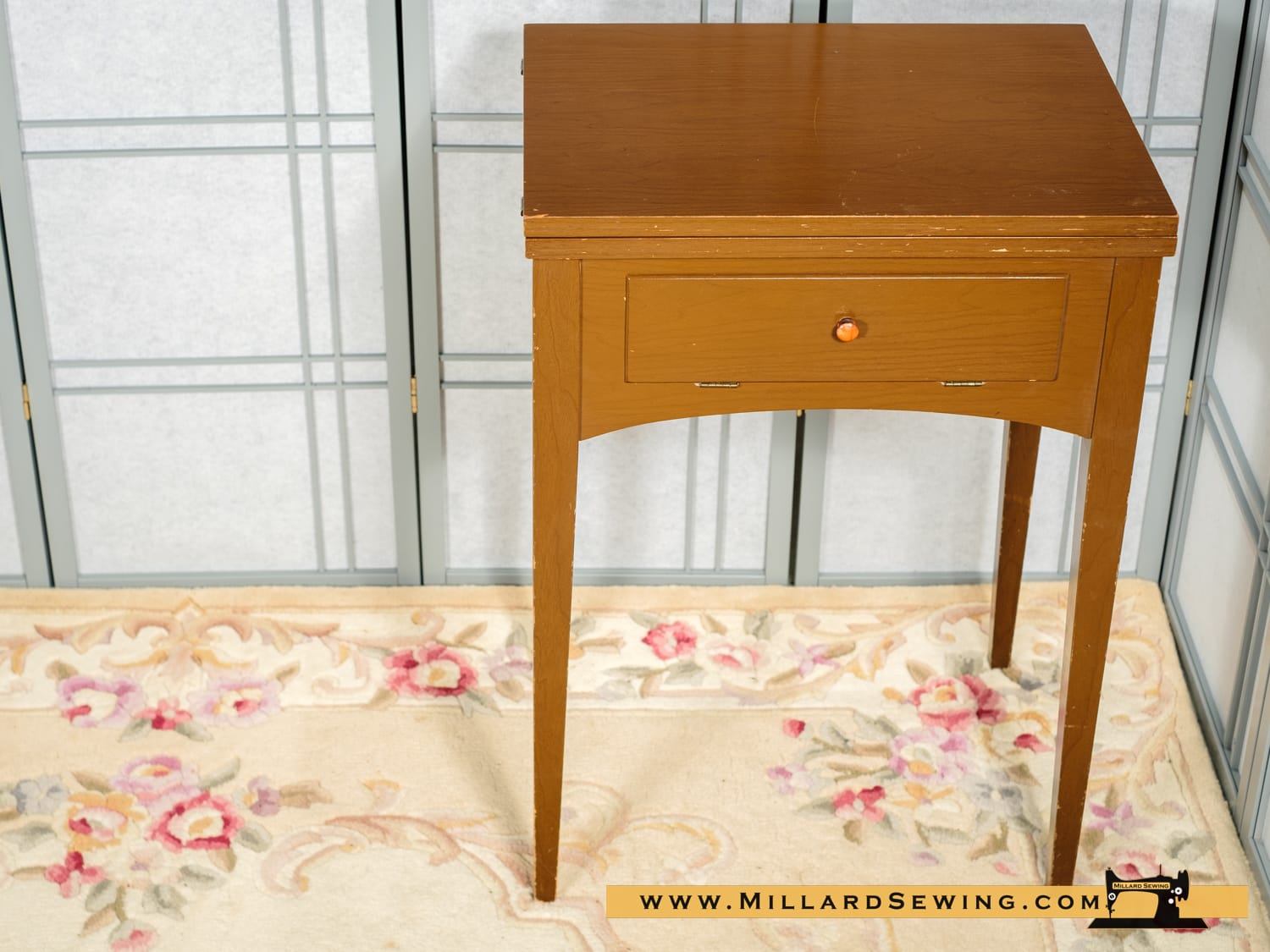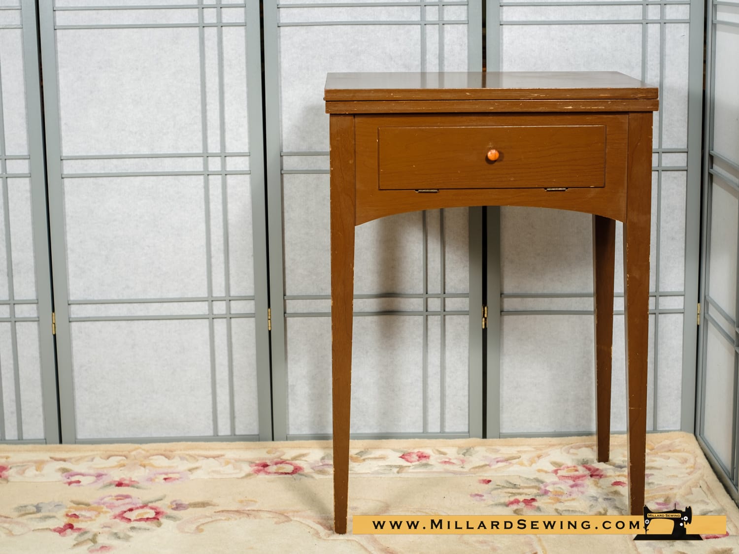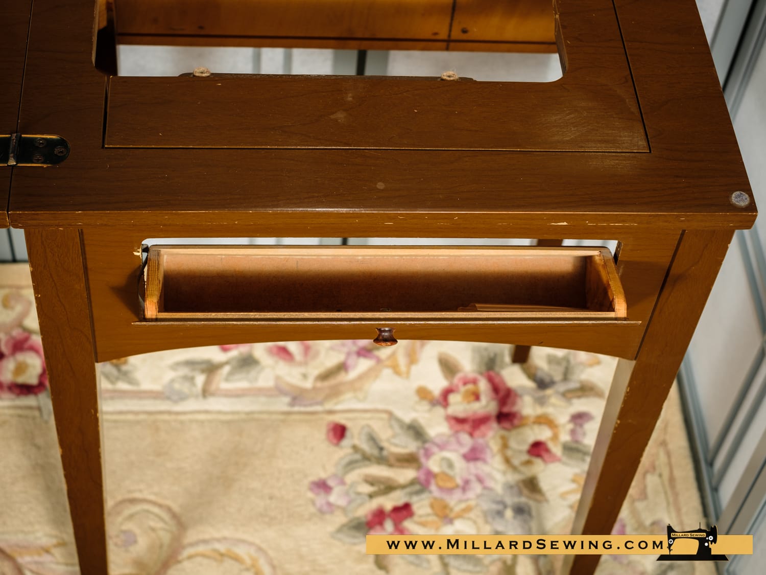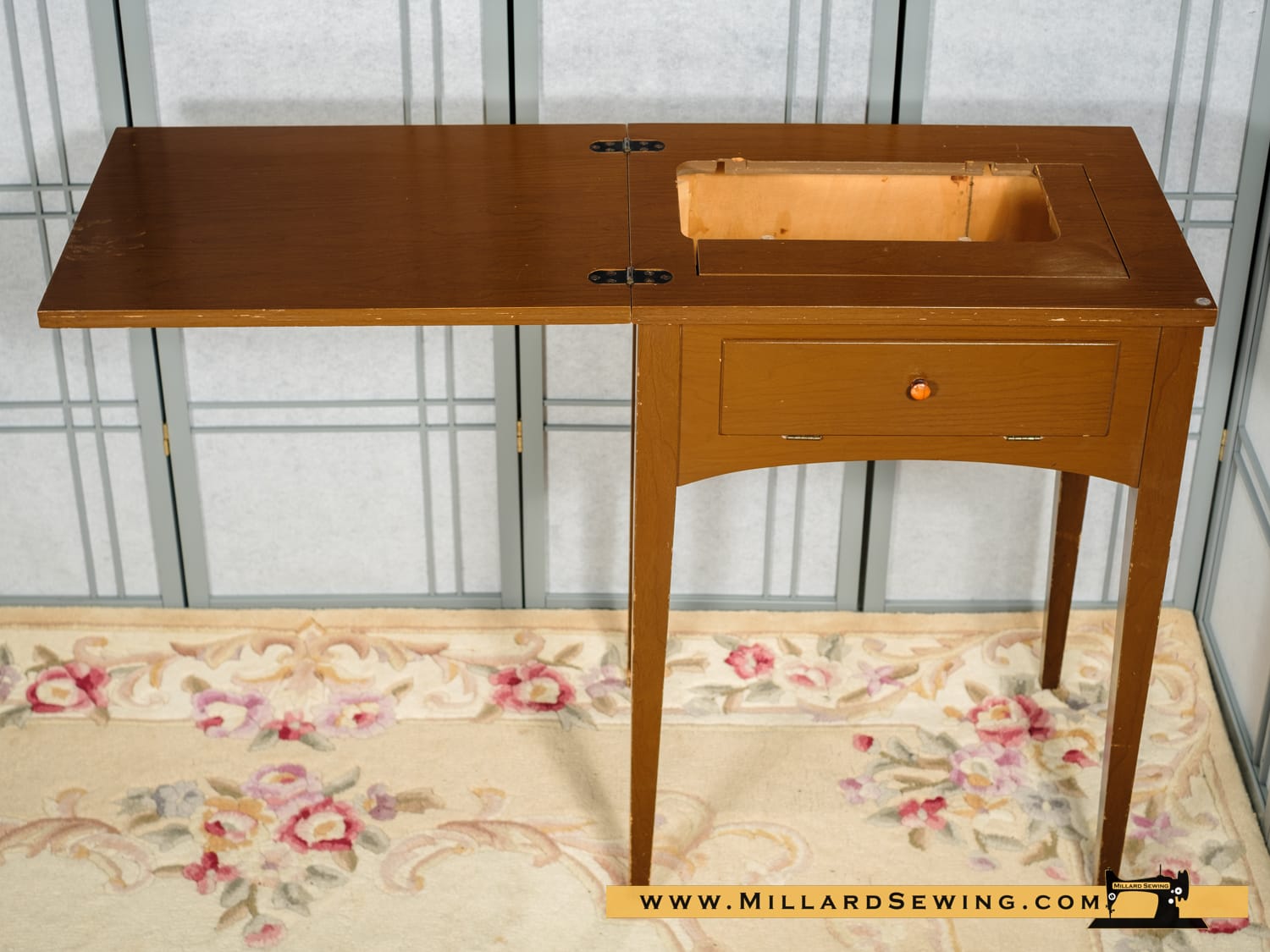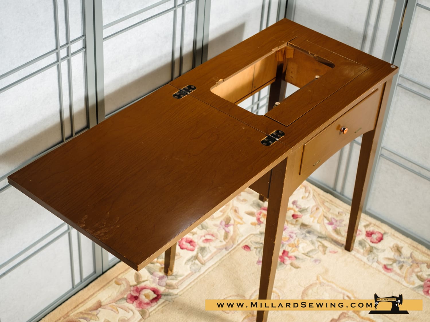 Hinge slot: 11.125″ between hinges. Left hinge 1.875″ from Left Side Could be re-drilled with standard top mount hinges to accept flat bed sewing machine. |