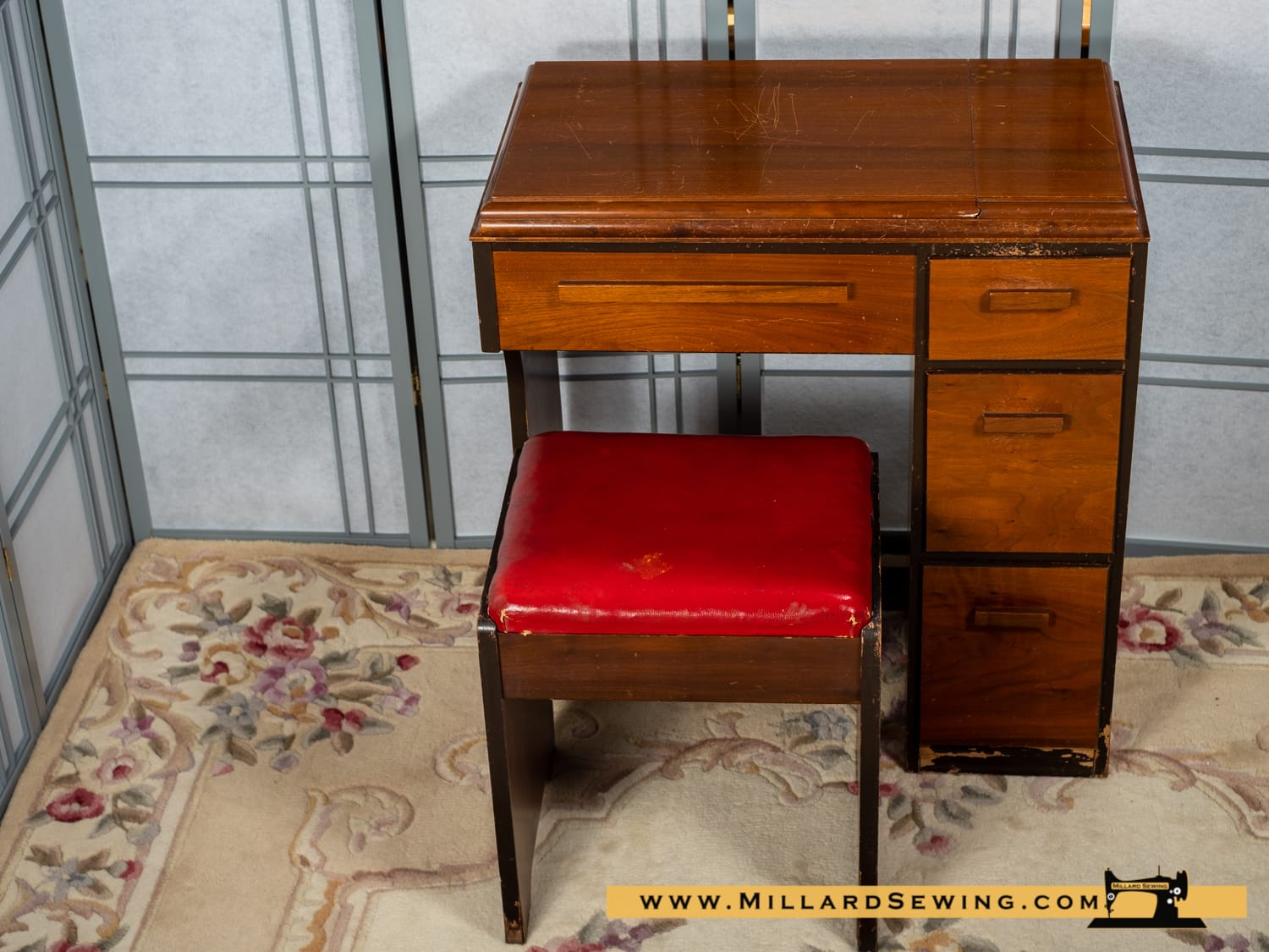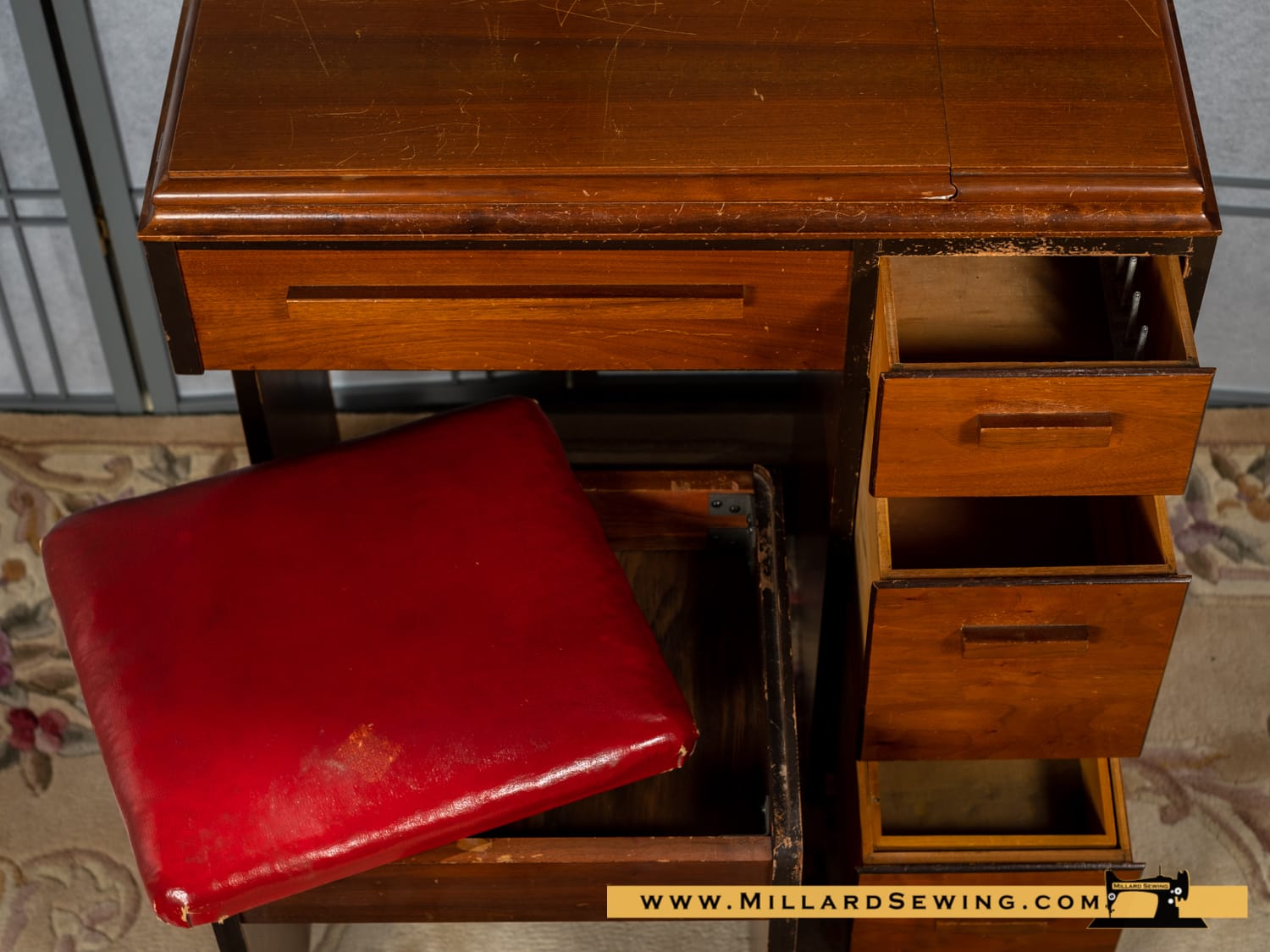 Under every good sewist is a chair holding them up.ย No really it’s true.ย The question is how does you chair offer additional storage?ย Does it match your vintage machine and cabinet? If those answers aren’t enough of a reason to “add to cart”, how about the fact that this one has been refinished in the original style vinyl covering to keep it period correct?