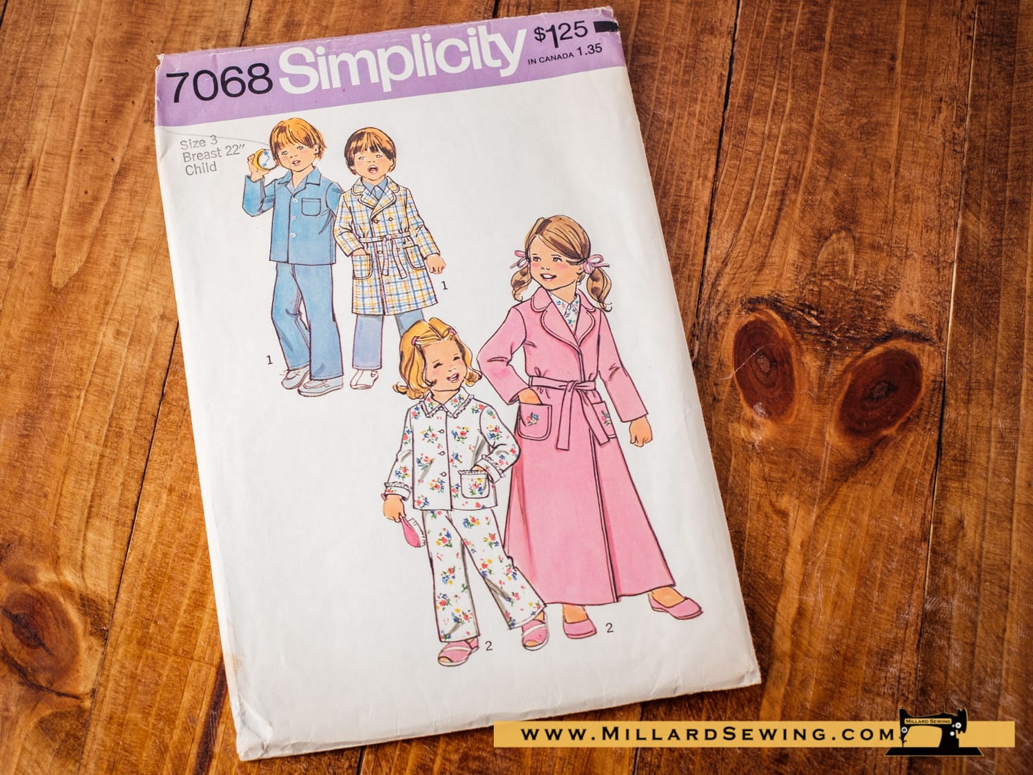 The pajamas have pants with elastic waistline casing. The top with patch pocket, collar, long set-in sleeves and sleeve bands has lace edging trim for girls. The top may be made with front button closing or decorative snap fasteners. The double breasted robe with optional front button closing and purchased appliquรฉ. has notched collar, patch pockets, long set-in sleeves, top-stitching and tie belt thru self fabric carriers. View 1 is regular length and View 2 is long length.
