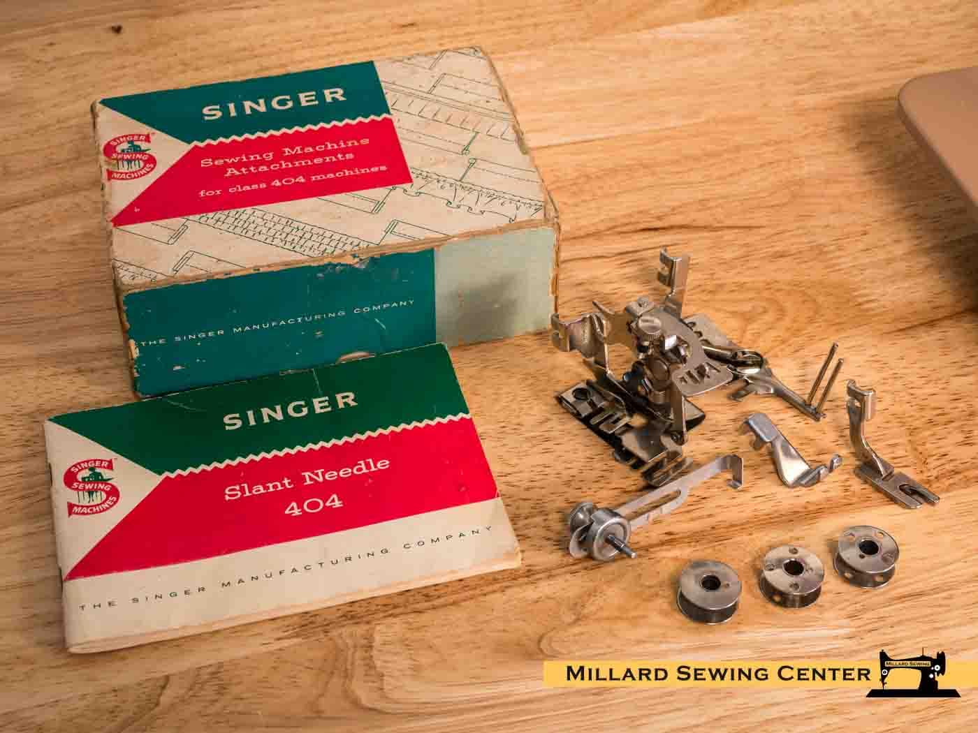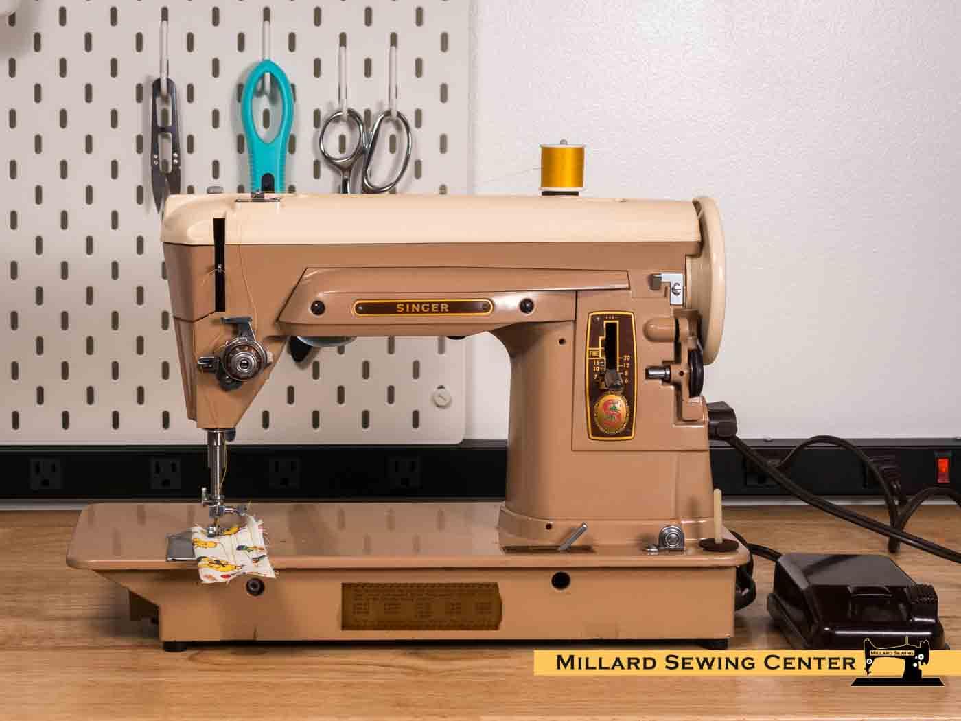 The Singer 404 is just that specialist.ย This is a no nonsense Slant Needle Machine that features all metal gears, and an internal gear drive motor and light. Unlike a lot of the classic straight stitchers, this one does have a reverse feature, and is bathed in and easy to keep clean cream and tan finish.