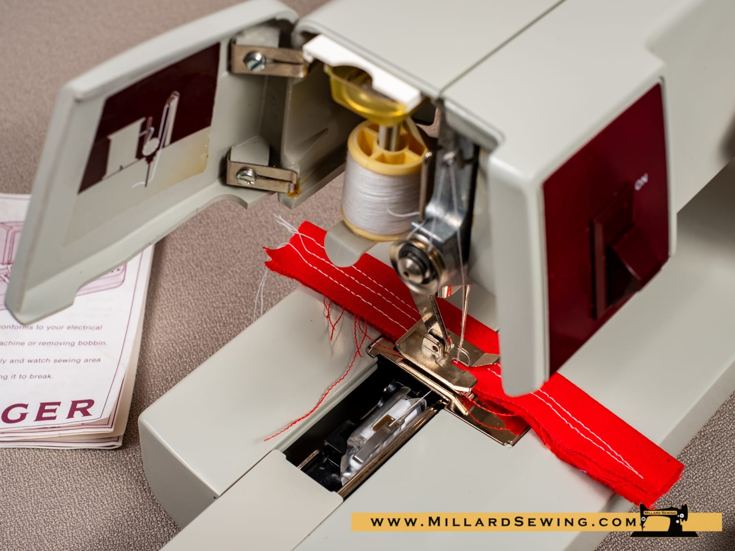 This Singer Tiny Tailor is a fun 80’s throwback that was in too good of shape and too complete for us to say no to.ย It is a working sewing machine using a plastic shuttle bobbin assembly to complete a straight stitch. It includes an extra bobbin and the bobbin winding adapter as well as the original instructions, power adapter, and box.