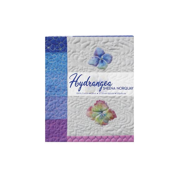 Theย Hydrangeaย Collection by Sheena Norquay presents an exquisite selection of Aurifil’s 100% cotton 28wt threads. Ten small spools in 10 different hues, each inspired by the unique spectrum of colours found in hydrangea petals, meticulously gathered from a variety of shrubs. The collection is characterised by its understated charm and romantic allure, reflecting the natural elegance and diversity of the blooms.ย