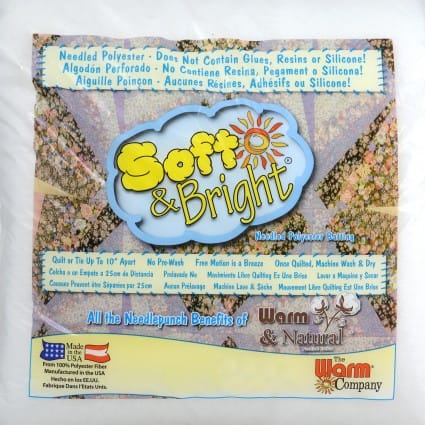 Soft & Bright undergoes the same manufacturing process that has made Warm & Natural, the world’s leading batting. Soft & Bright consists of premium grade polyester fibers, needle-punched into a strong paper thin base material that holds the fibers in place, keeping the batting even and consistent. The high quality polyester fiber is soft and fluffy to the touch. The evenly layered fibers of Soft & Bright will stay in place inside your quilt and Soft & Bright will keep its shape even after a lifetime of gentle washings. The thin base material holds the fiber in place preventing slipping making free motion quilting a breeze! Top and backing fabric will cling to Soft & Bright as it is fed through your machine, making basting spray a thing of the past. Soft & Bright can be quilted or tied up to 10″ apart so you can finish quilts even faster! Confidently use Soft & Bright in a hoop for embroidery and hand quilting without worry of distorting. Machine wash and dry finished quilts without any shrinkage. Soft & Bright is preferred for use in children’s quilts as they require more frequent washing and Soft & Bright quilts dry so quickly. Fiber Content: 100% Polyester with Scrim
