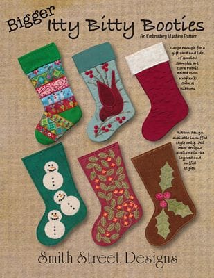 Brief Description for Catalog & Bigger Itty Bitty Booties is an embroidery machine pattern that has a dozen embroidery designs for Christmas stockings completed in the hoop. Suitable for different kinds of fabrics such as felted wool, Kraf-tex, cork fabric lightweight cotton, silk, and even ribbons. Some of the designs require additional machine stitching. The designs are about 7½in high x 5in wide. ART, DST, EXP, HUS, PCS, PES, VIP, VP3, XXX formats.