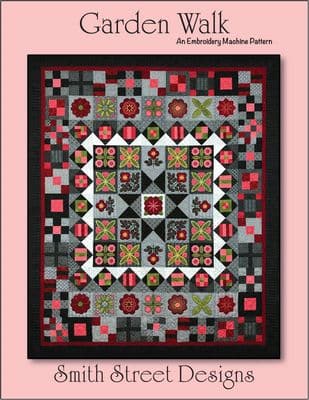 Garden Walk is an embroidery machine appliqué quilt pattern with a CD and includes 13 embroidery designs and 16 pieced block designs. The embroidery designs include Tack & Trim lines, and pre-cut options for the appliqué pieces include PDF files to print on fusible web, Silhouette cut files, cutwork files, and SVG files. Instructions included for lap, twin, queen, and king size quilts. The largest embroidery design has a sewing field of 4.96 in x 4.96 in. ART, DST, EMB, EXP, HUS, JEF, PCS, PES, VIP, VP3, and XXX formats.