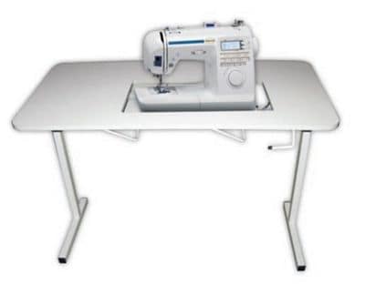 A combination of compact design and lasting function, the Folding Sewing Table is both portable and easy to use. This sewing table can be used for free arm sewing projects, flatbed sewing, and other projects. The Folding Sewing Table comes completely assembled with a smooth laminate surface and sturdy steel legs.