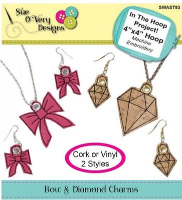 Require a 4 in x 4 in hoop. Bow and Diamond – Charms – ITH. Bow and Diamond Charms come in two different sizes: Bow – Necklace (Large): 2-3/4 tall x 1-1/2 wide and Earrings (Small): 1-3/4 tall x 3/4 wide. Diamond – Necklace (Large): 2 tall x 1-1/2 wide and Earrings (Small): 1-1/4 tall x 3/4 wide. Designed for a non-woven material such as cork or vinyl. Finish the jewelry set off with nice jewelry hardware. Finish the edges with some simple fabric paint for a professional touch.ย If making into necklace and earrings you will need: (3) 5/8in eyelet, (2) fishhook earring findings, (3) large spring ring and (2) small spring rings. Perfect Scrap buster using only (2) 3 in square pieces of cork material or any non-woven material.